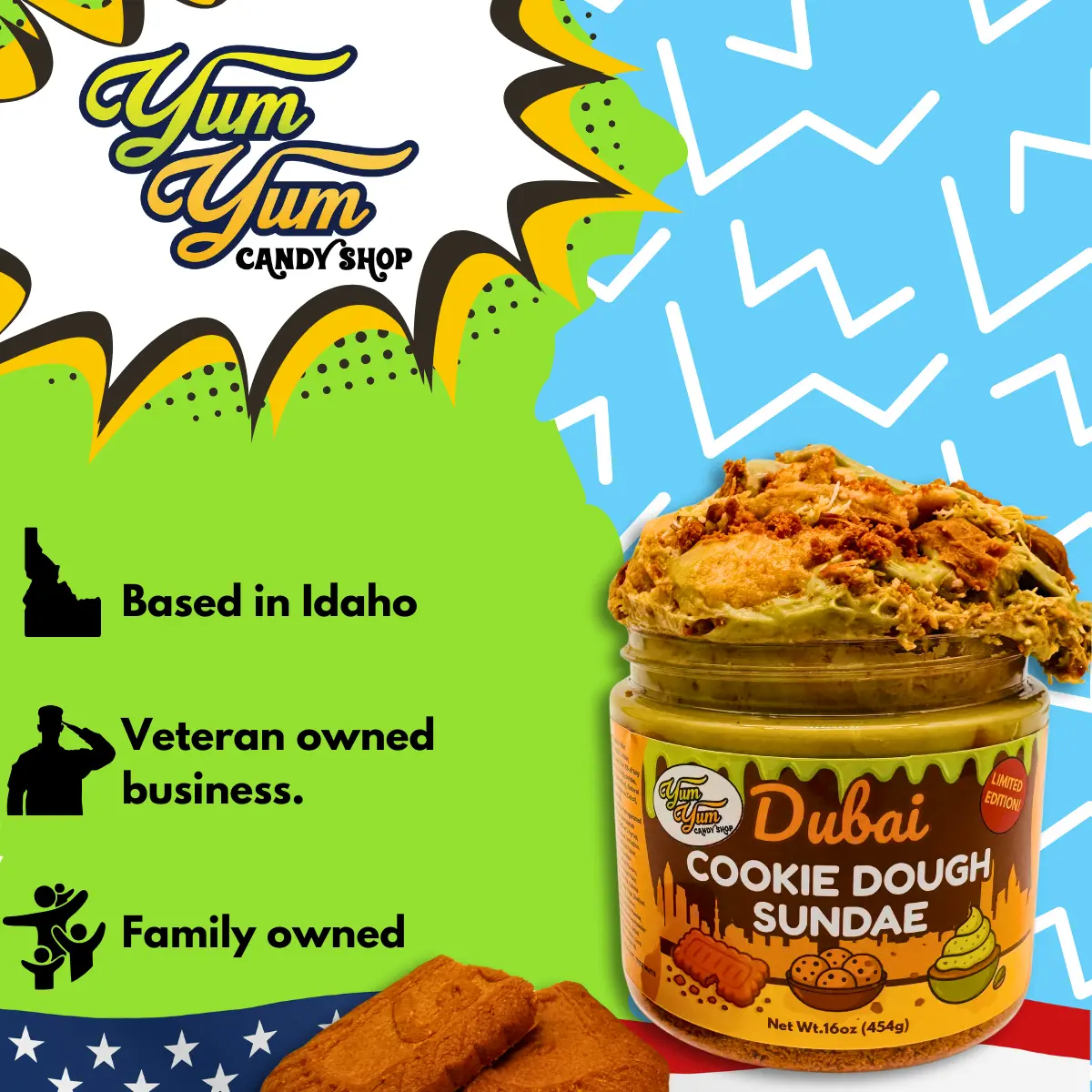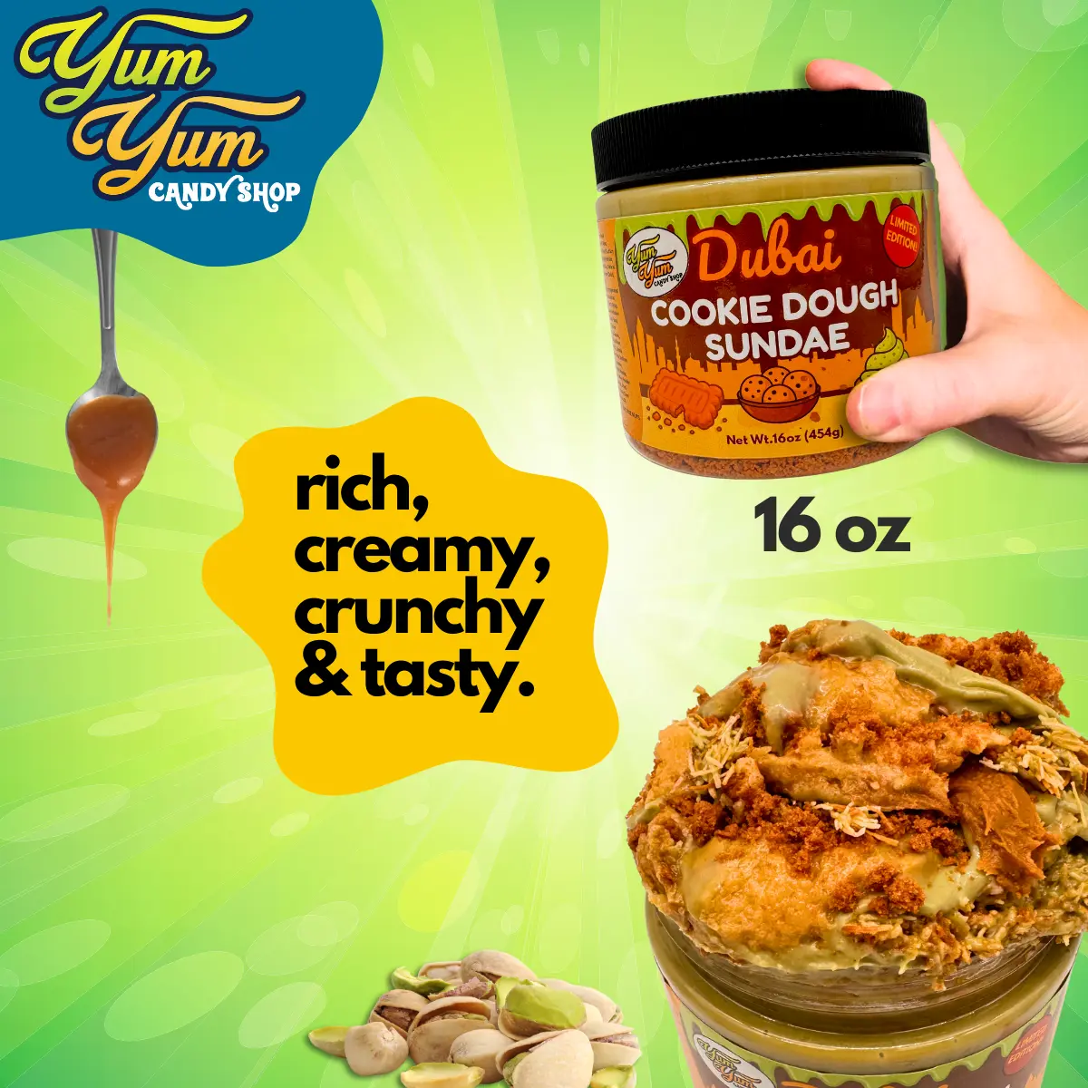 Discover the indulgence of our Dubai Cookie Dough Sundae, a one-of-a-kind dessert jar layered with flavors inspired by the world’s most decadent cookies. Every 16oz jar is packed with rich textures, creamy layers, and a crunch you’ll crave.
