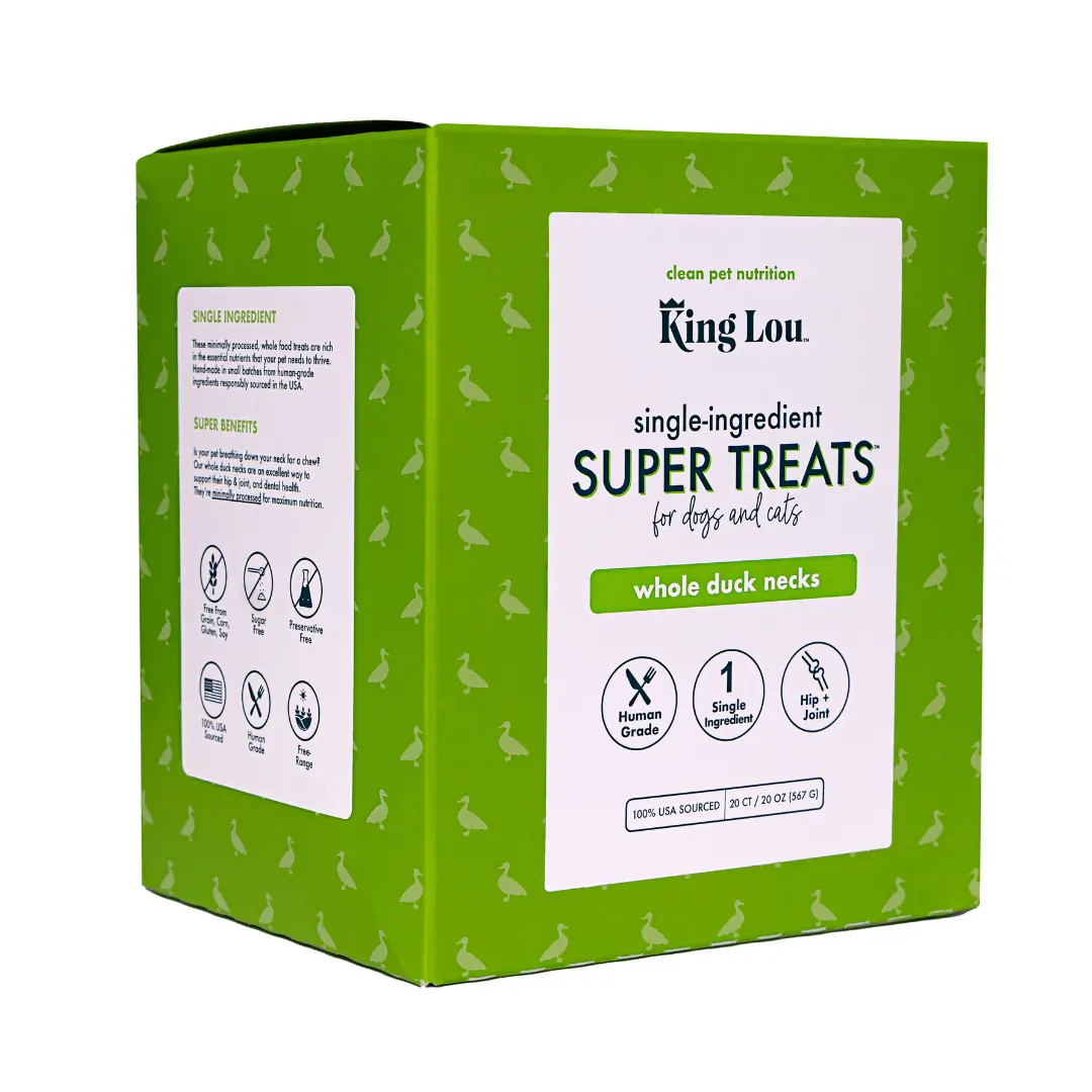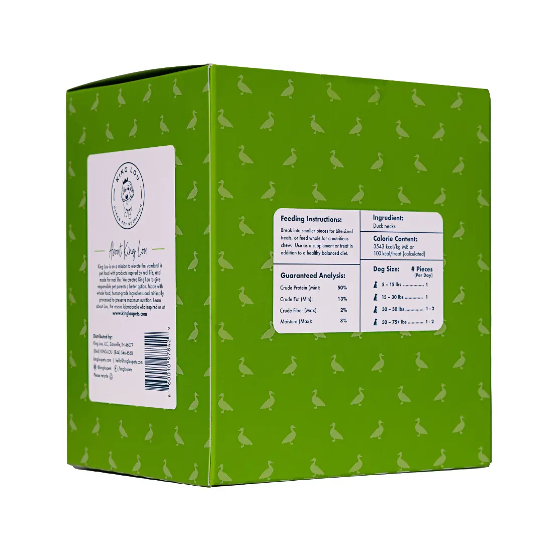 We LOVE King Lou! I have two massive babies, Maleficent and Mini Max (160lbs each) and they live for their Duck Necks. Best single Ingredient health food for your dogs around, hands down.