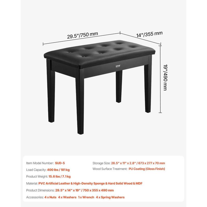·Duet Piano Bench: Designed with a 26.5" long seat, this duet piano seat comfortably accommodates two musicians. Featuring a robust 400lbs weight capacity, this piano seat is ideal for use in both home settings and professional studios. With its spacious design, it provides an ideal seat for shared music sessions.