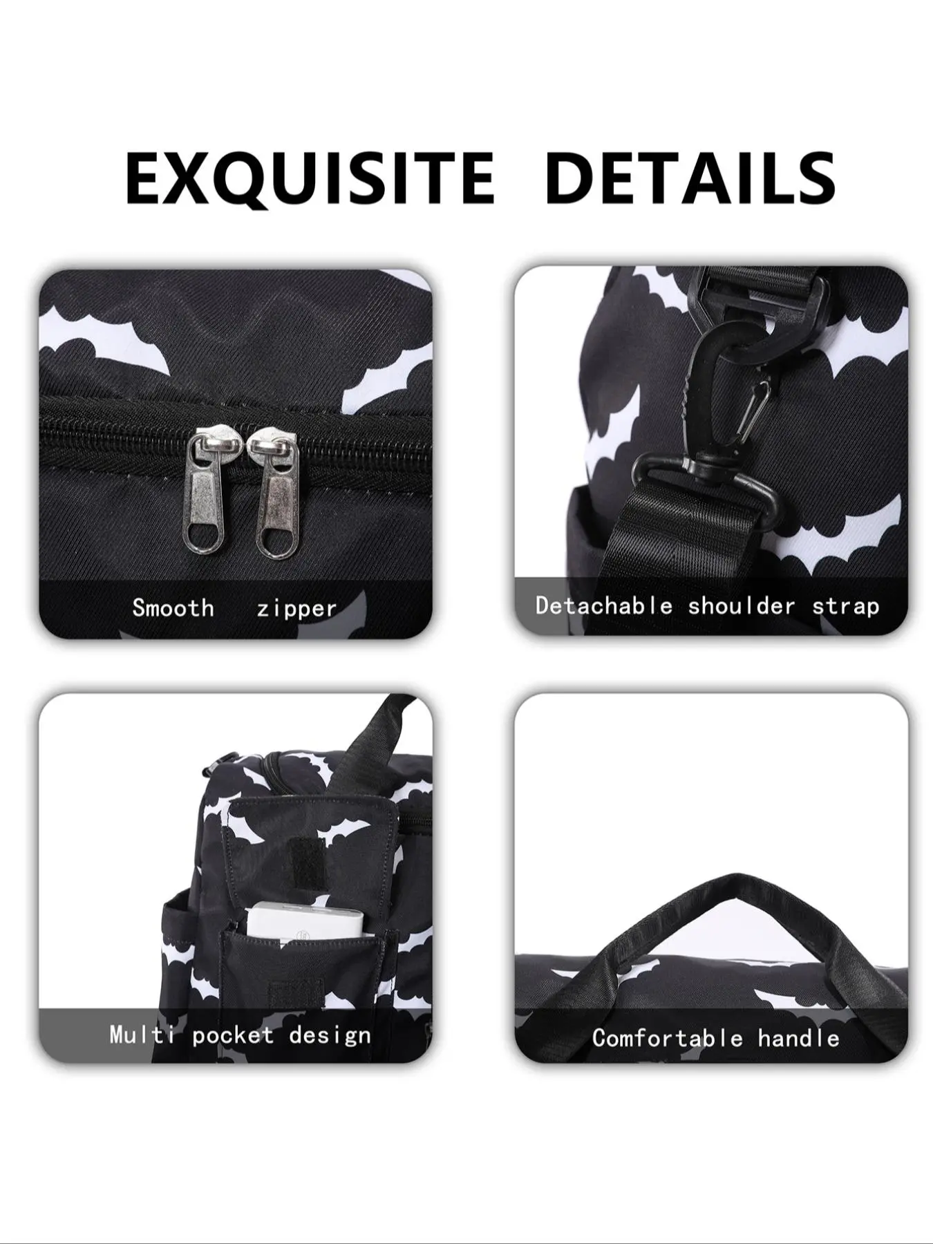 Great bag, well mate, very roomy and super cute. Great food any time you need to pack a bag!!!!!!!!! I'm very pleased with this purchase and look forward topacking it and taking it to camp and in Babson. Would regimes to anytime who likes bats or wants a super cute and unique bag for travel. 10