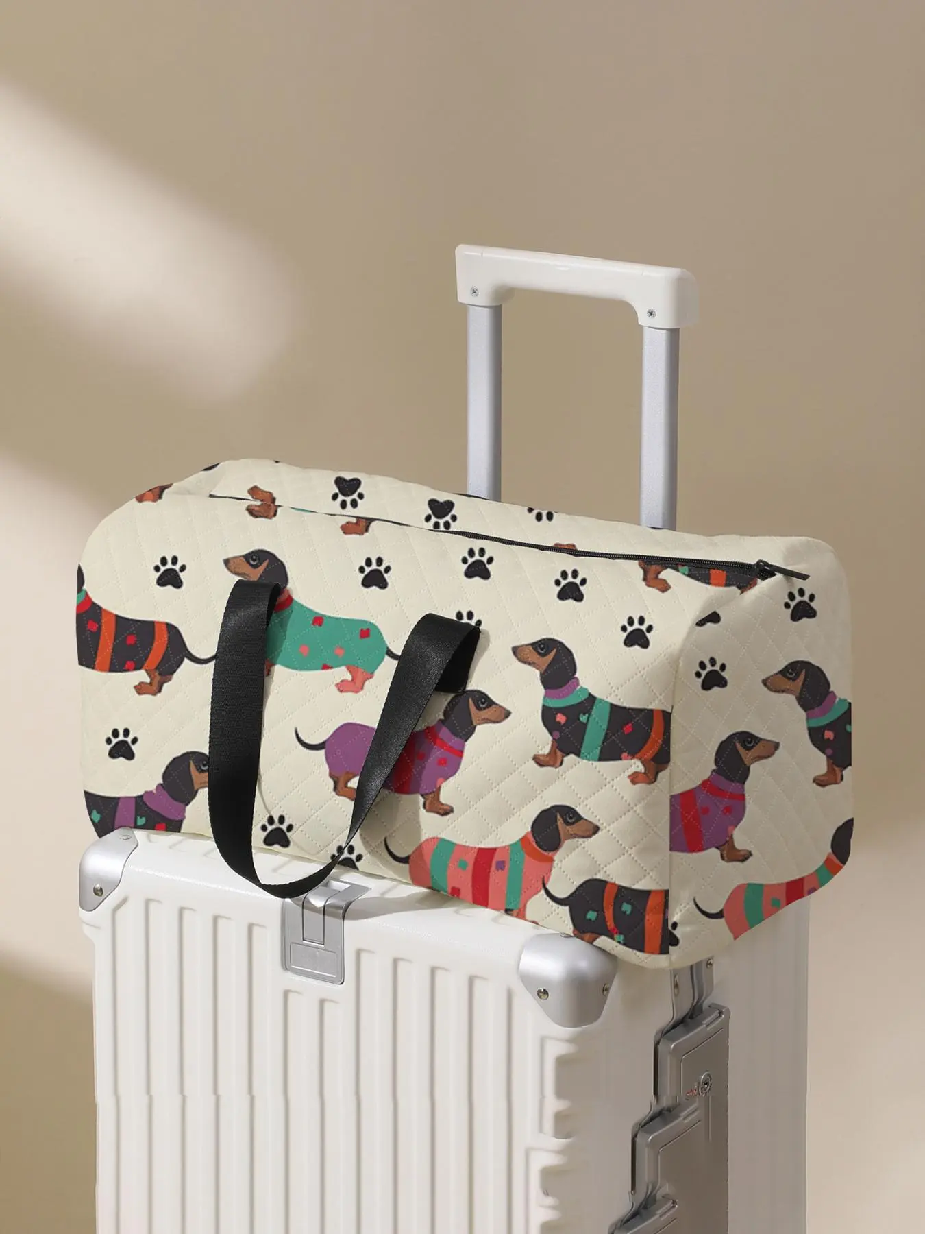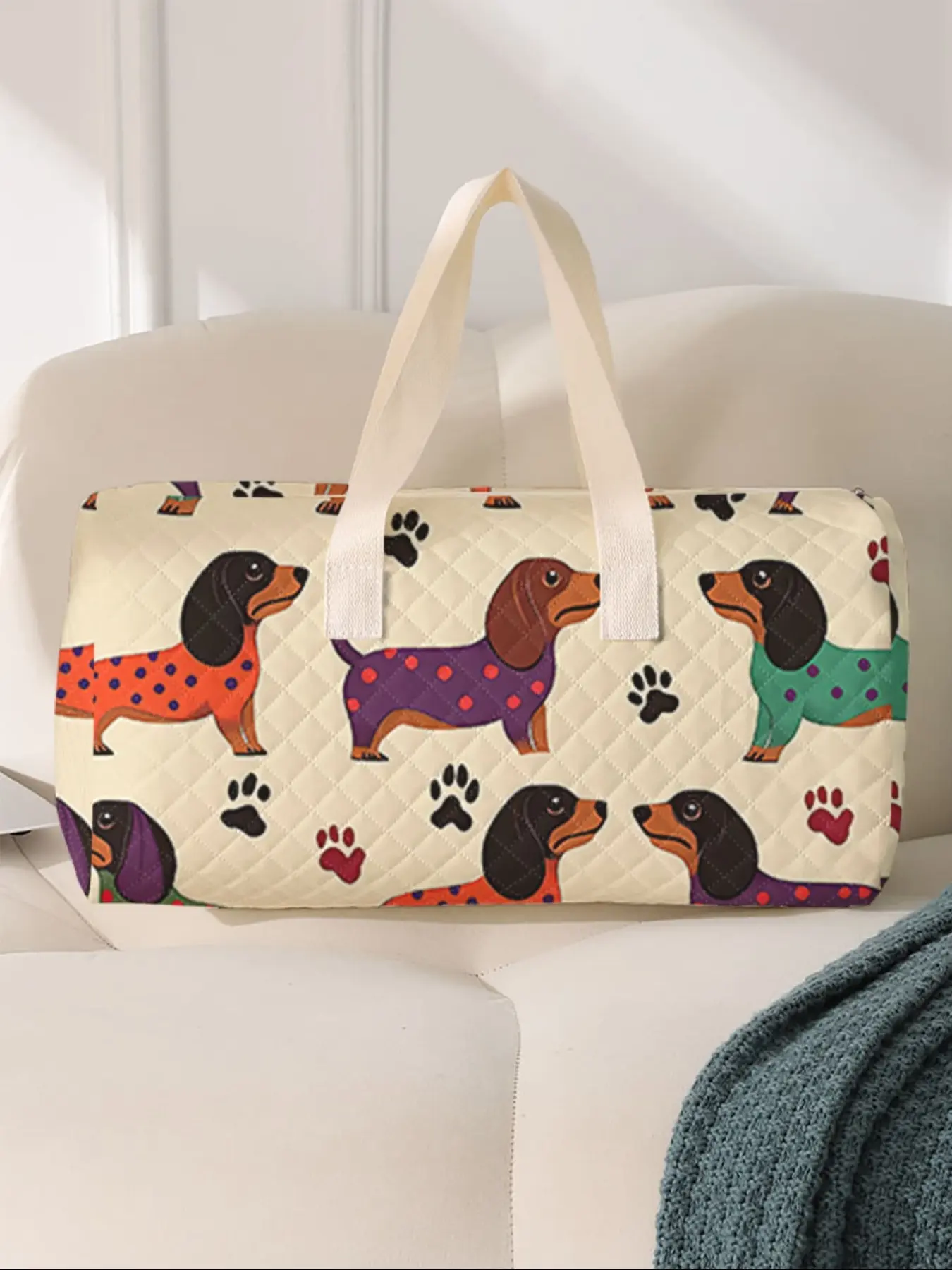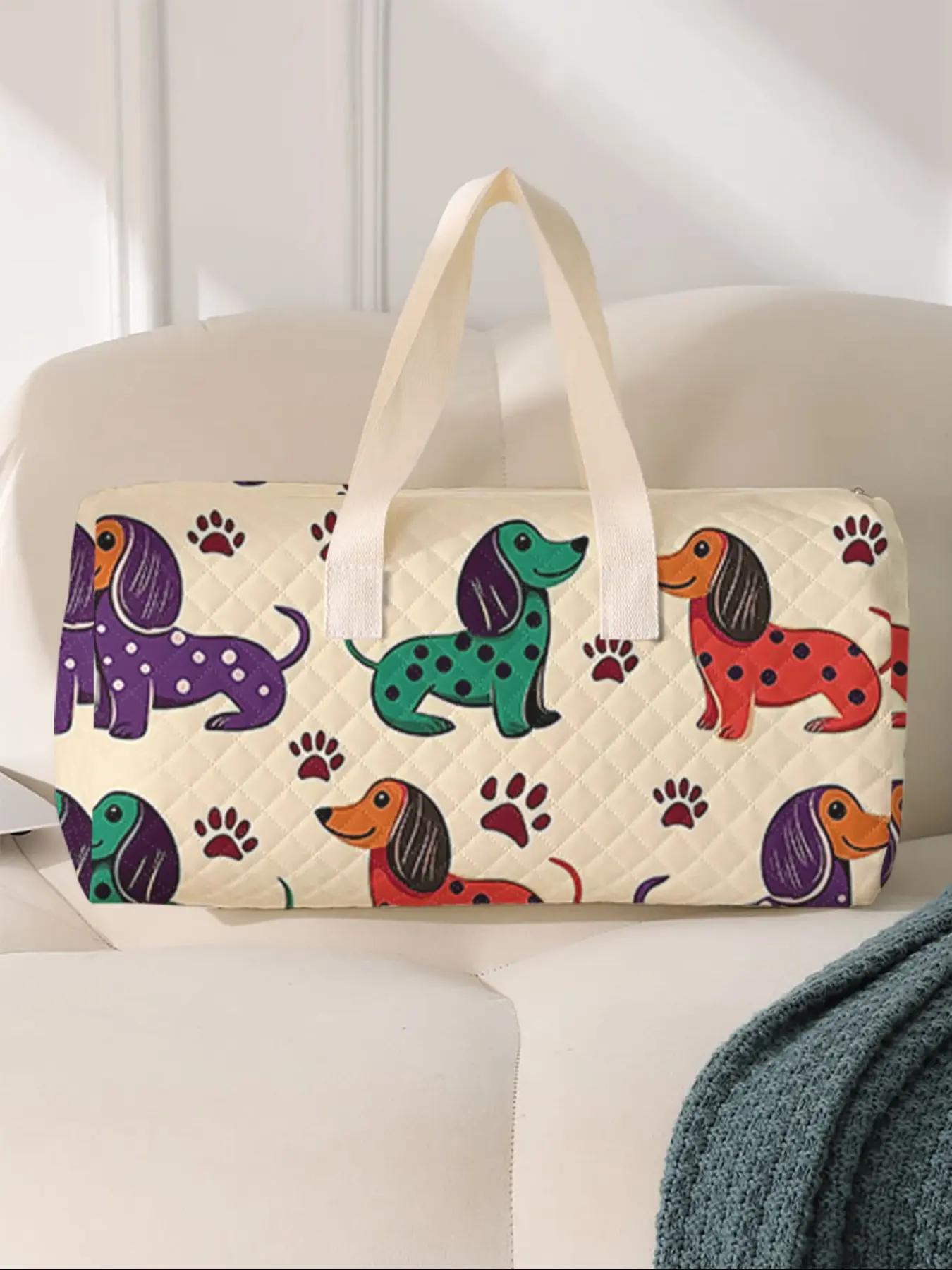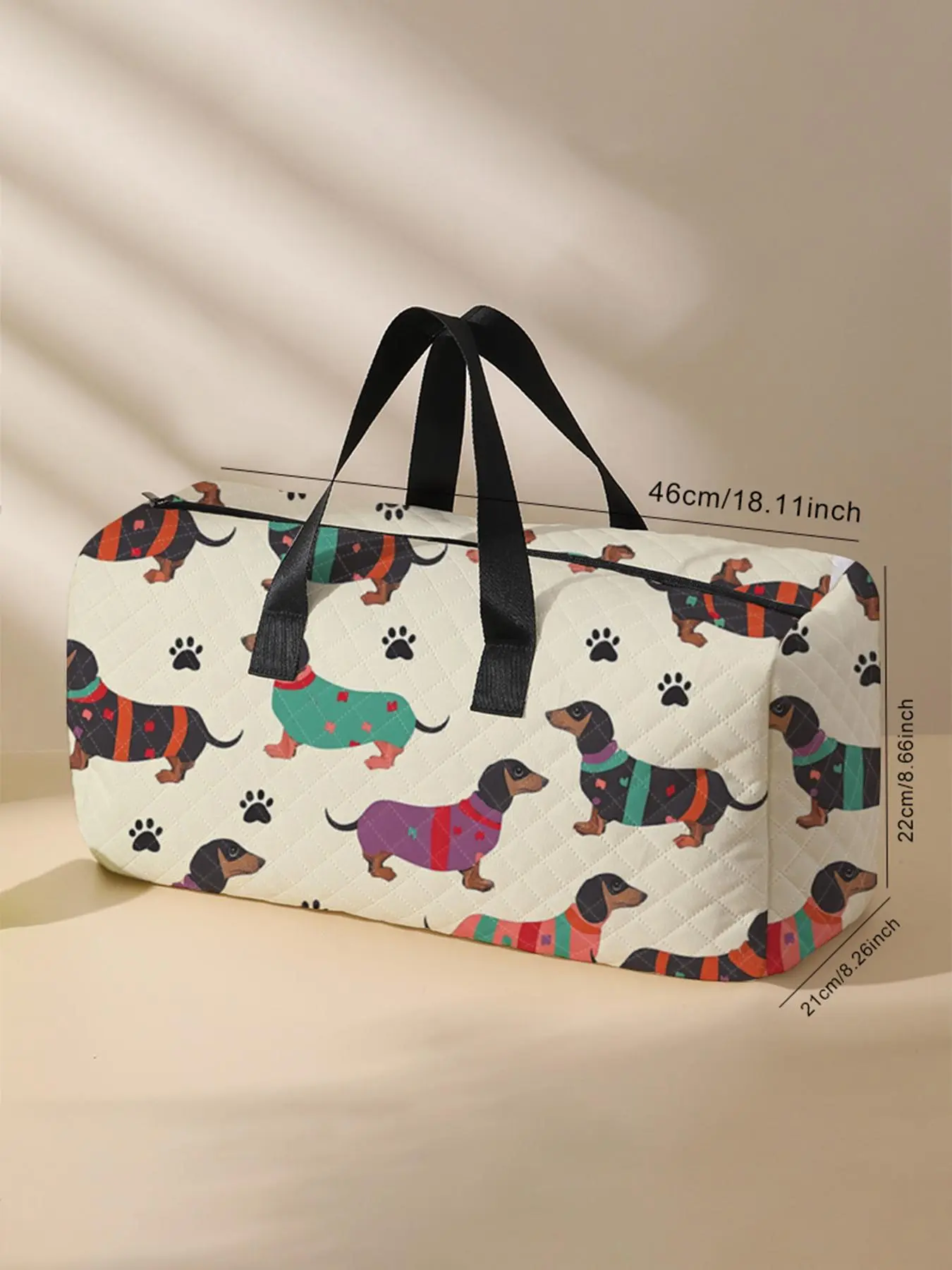 Very cute quilted bag. Can be used as an overnight bag also. Very bright print. And who doesn't like a dachshund.