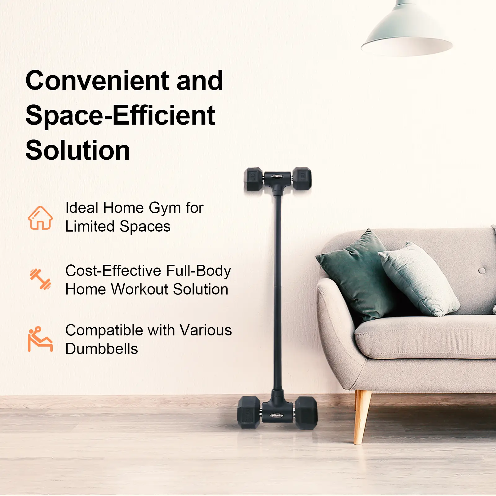 Combines dumbbells and barbells into one. Saves space without sacrificing performance.