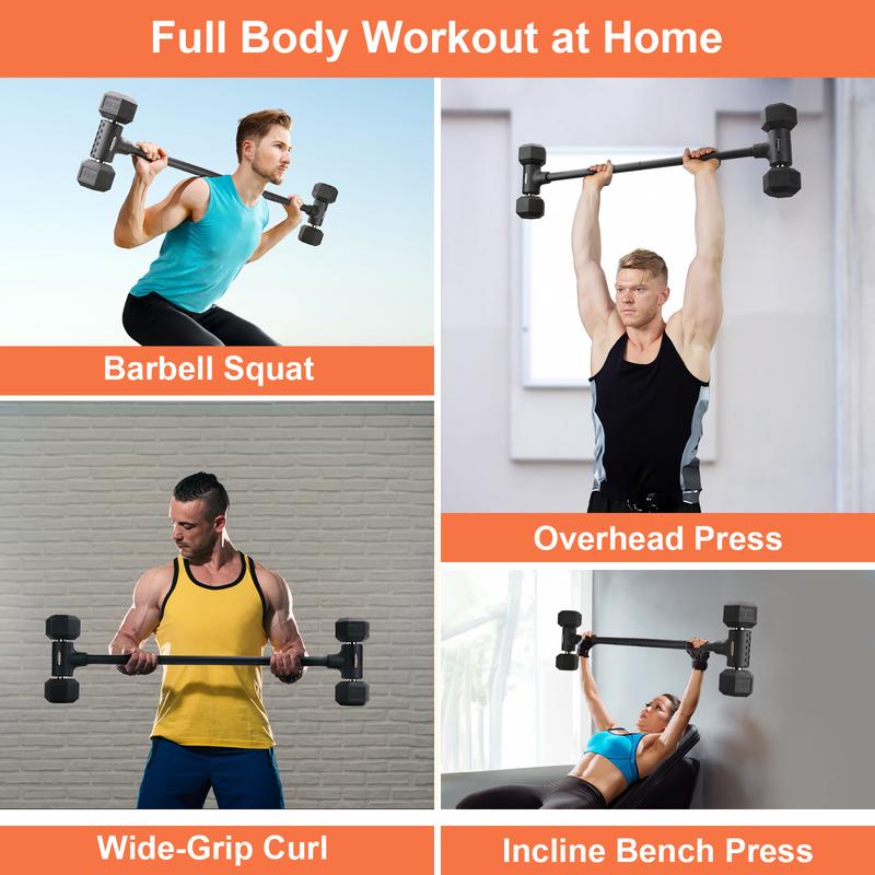 Easily convert your dumbbells into a barbell. Perfect for squats, presses, deadlifts, and more—all with one compact tool.
