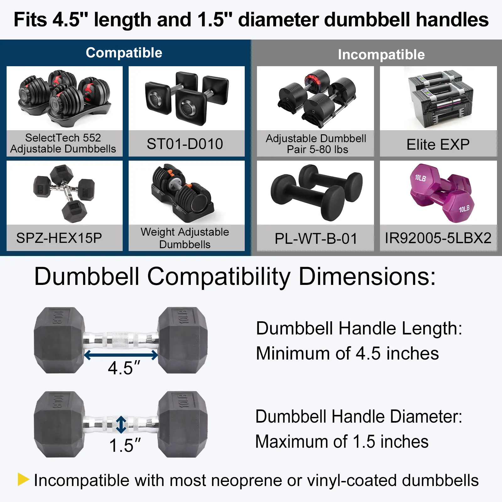 Designed for dumbbells with 1.5" thick, 4.5" long handles. Works with most standard sets—no need to buy new gear.