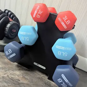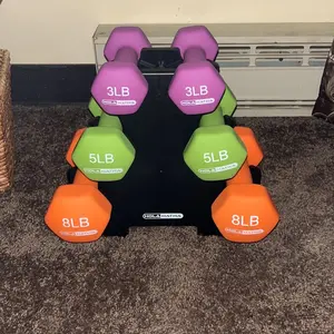 The HolaHatha Dumbbell Set includes 2 each of 3, 5, and 8-pound weights, perfect for strengthening and conditioning exercises. Made of durable cast iron, these non-slip, hex-shaped dumbbells are ideal for various workouts like lunges, curls, and cardio. The compact handles suit smaller hands, and the set comes with a convenient storage rack for easy organization.