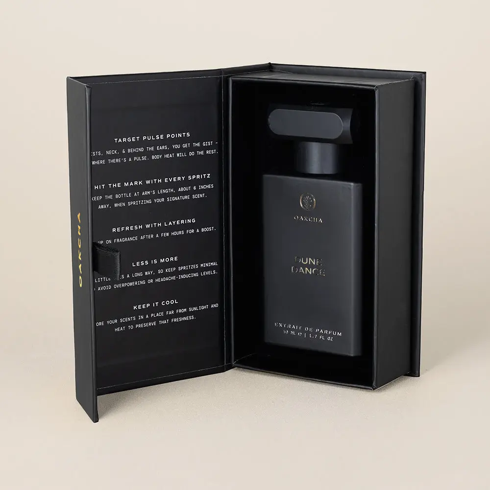 Crafted as a high-concentration Extrait de Parfum, Dune Dance offers exceptional longevity and a warm, enveloping trail—made for those who crave depth, warmth, and nocturnal allure.