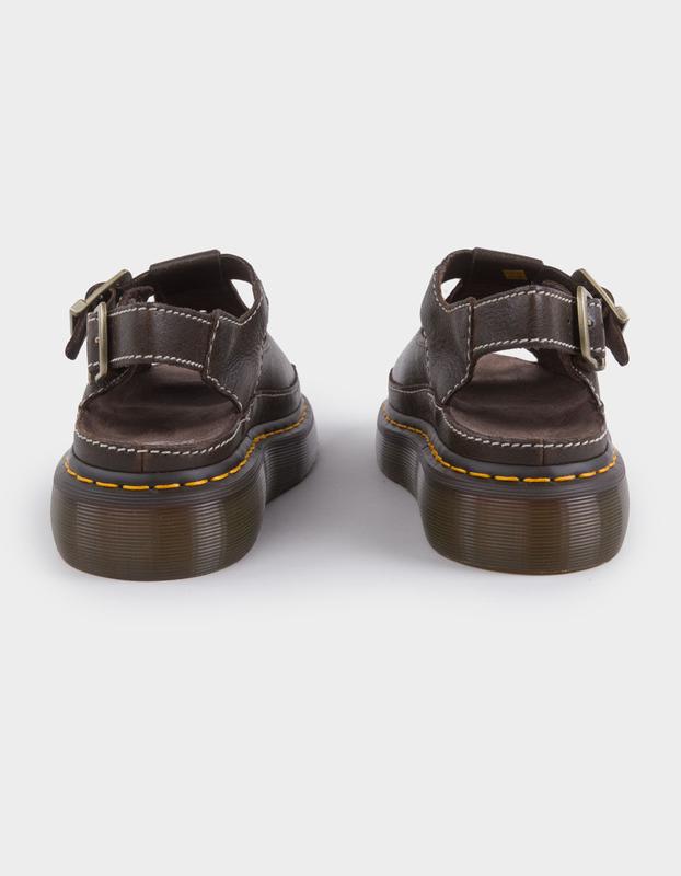Dr. Martens Dunnet Flower Full Grain Leather Sandals. 90s-inspired sandals you won’t want to take off. The Dunnet Flower sandal is made with textured, full-grain AR Rogue leather in kelp brown — with an archive-inspired floral cut-out that’s emphasized by contrast stitching across the upper. Built with a suede-covered foam footbed for enhanced comfort and adjustable buckle straps to help you find the perfect fit. Dr. Martens' grooved, air-cushioned Quad Shore platform sole is secured with a durable Goodyear welt and sewn with their classic yellow welt stitching. Imported.