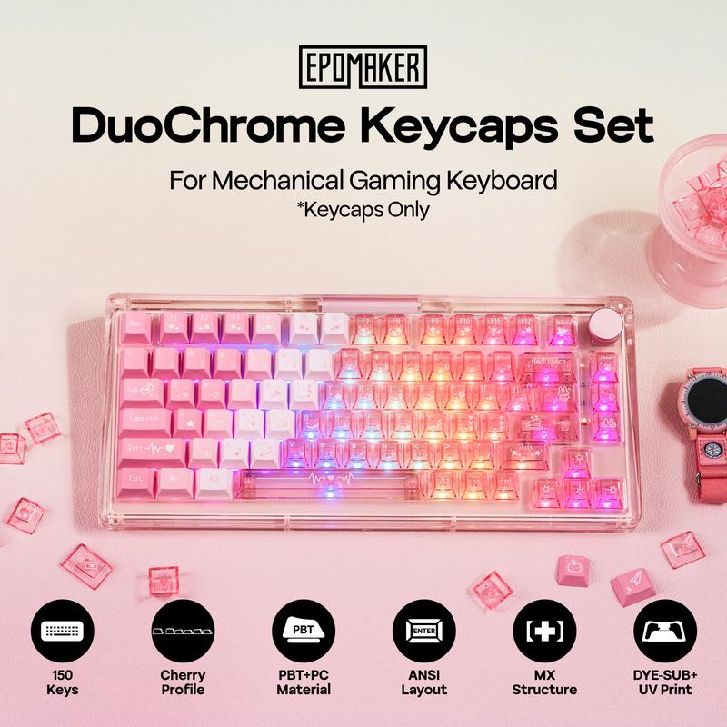 DuoChrome Keycaps Set: Crafted with meticulous care by EPOMAKER, the DuoChrome keycap artfully blends the concepts of "Duo" (dual) and "Chrome" (color/luster), symbolizing the perfect fusion of dual materials and vibrant colors. In terms of materials, the powerful combination of PBT and PC delivers both wear-resistant durability and a comfortable typing feel. More than just a set of keycaps, this is the sweet crystallization of inspiration and design—adding a unique touch of romance to your mechanical gaming keyboard