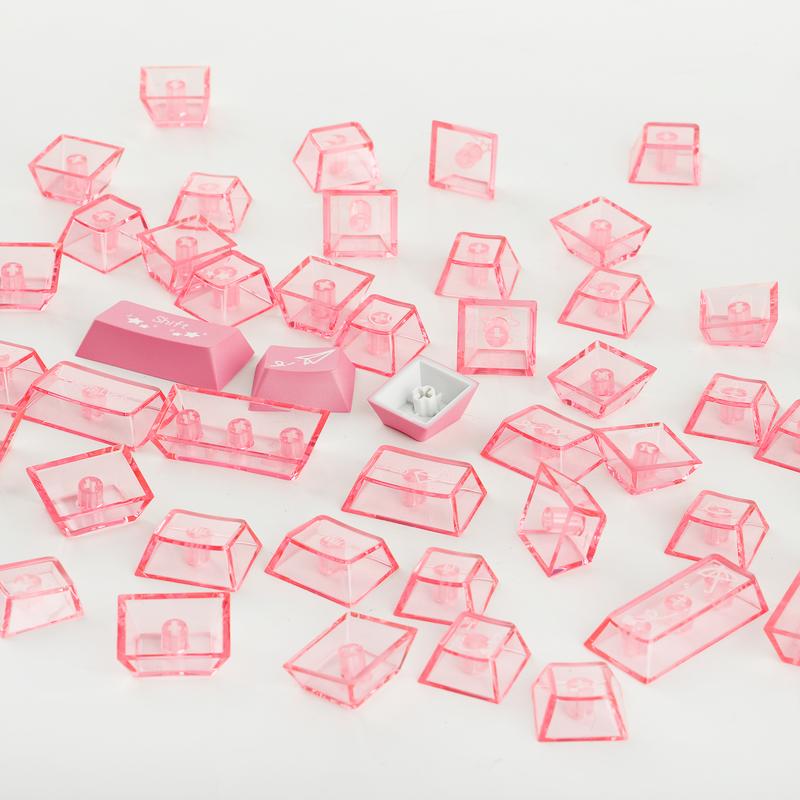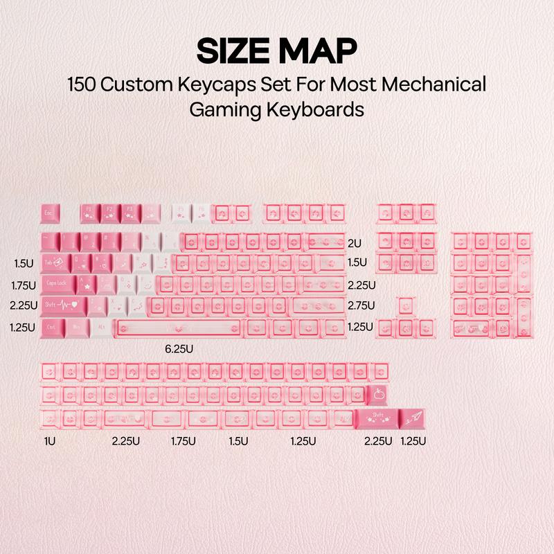 Number of Keys: The set includes a total of 150 keycaps, with 35 keycaps crafted from premium PBT material and 115 keycaps featuring the shine-through design made from transparent PC material.