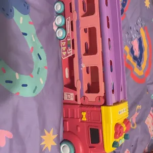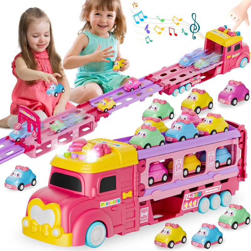 This multifunction truck toy features dinosaur, princess, and unicorn themes. It includes a foldable track and 2-player race mode. The toy comes with 6 dino cars and 12 accessories. Ideal for birthday and Christmas gifts for kids and girls.