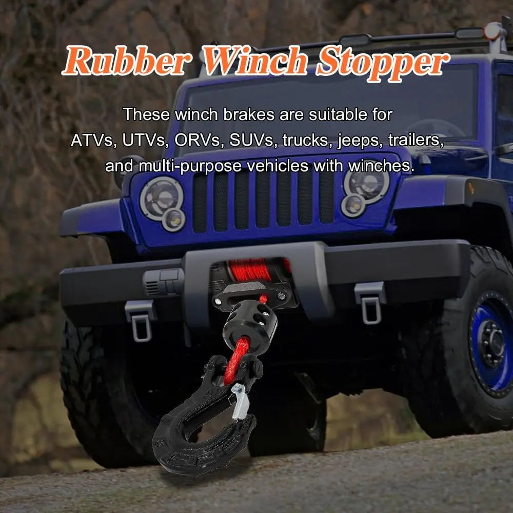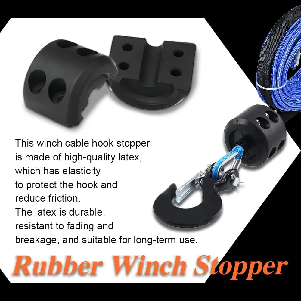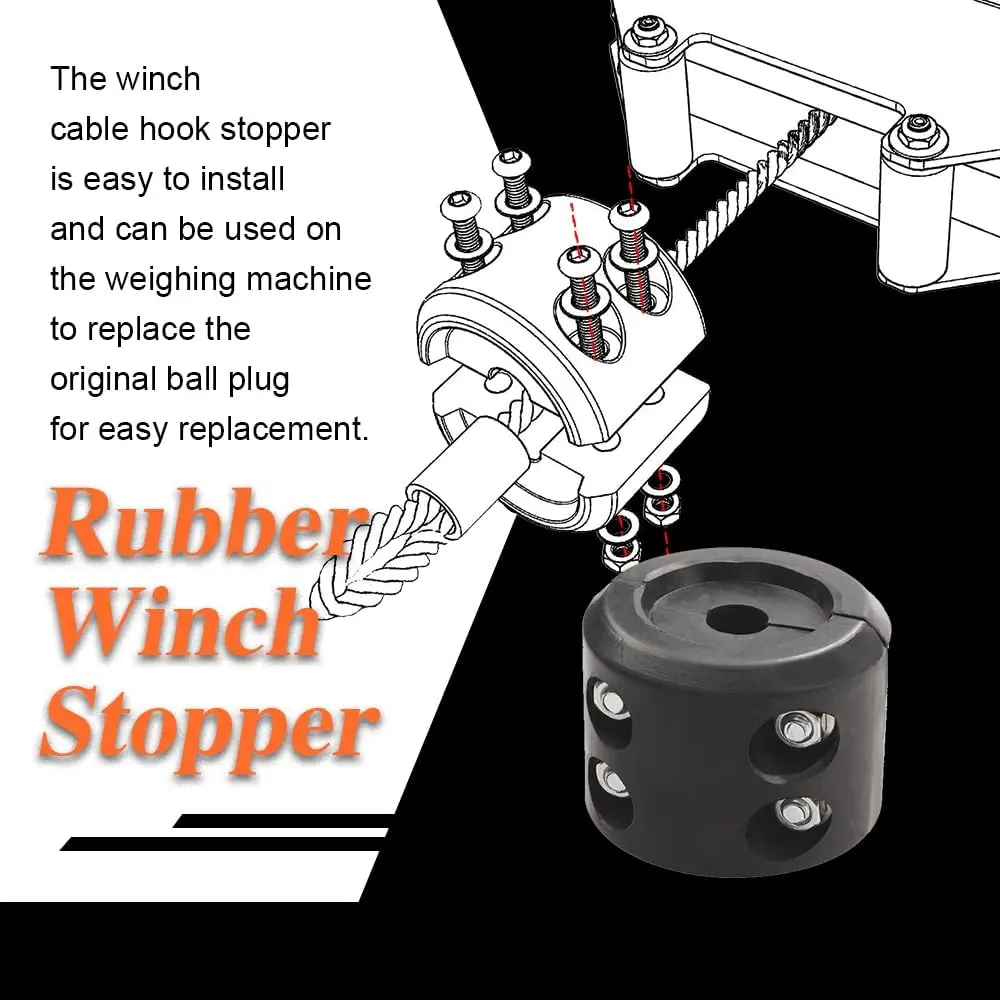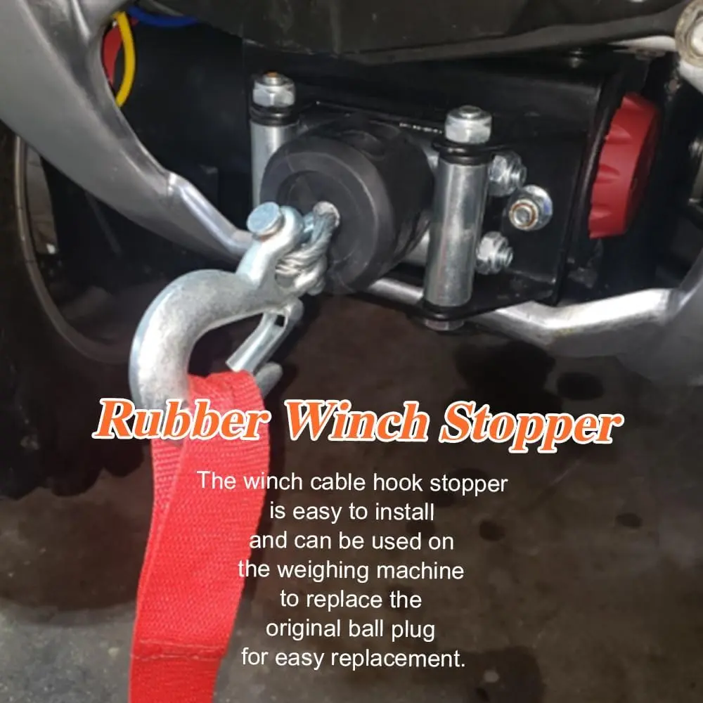 Durable material: The utv winch stopper is made of tough rubber material, with good elasticity, water resistance, impact resistance, high temperature and wear resistance, can maintain long-term flexible use, not easy to break or deformationMain function: The winch stopper for wire cable can effectively reduce the winch rope bounce, wear and abnormal sound, and can make the hook maintain good tension, avoid cable loosening and falling off, and help prevent cable distortion and damage, improve the use of safetyEasy to install: The winch cable hook stopper comes with mounting accessories such as screws and wrenches to help you use it, simply slide it onto the cable and then use wrenches and screws to hold it in place.Can be used on weighing machine for easy replacement of original spherical plugWide application: The winch stopper for synthetic rope can be widely used in ATV, UTV, ORV, SUV, truck, trailer and most multi-purpose vehicles with winch, to meet the needs of different owners, to provide good protection for the winch motor and gearPackage content: You will receive a piece of this rubber winch cable stopper, four screws and washers, and a hexagonal wrench, complete accessories to meet your installation and use needs, bring you a good use experience