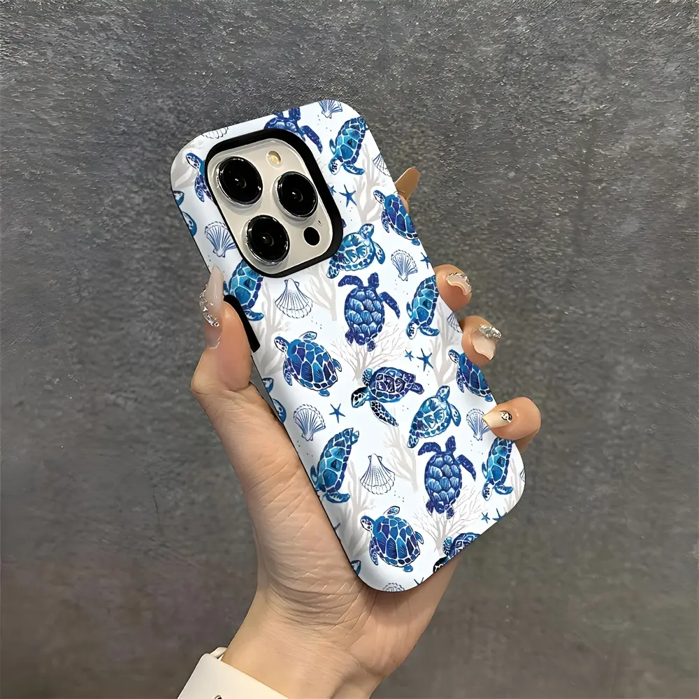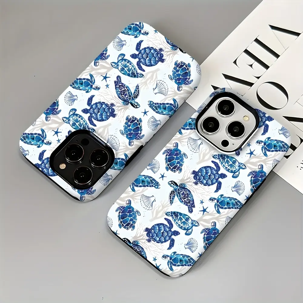 A durable 2-in-1 protective case with a turtle shell design, ocean blue background, and coral and seaweed patterns. It's compatible with iPhone 17/16/15/14/13/12/11 Pro Max/Plus/Pro and Samsung Galaxy S25/S24/S23 Ultra series. Also suitable for couples.