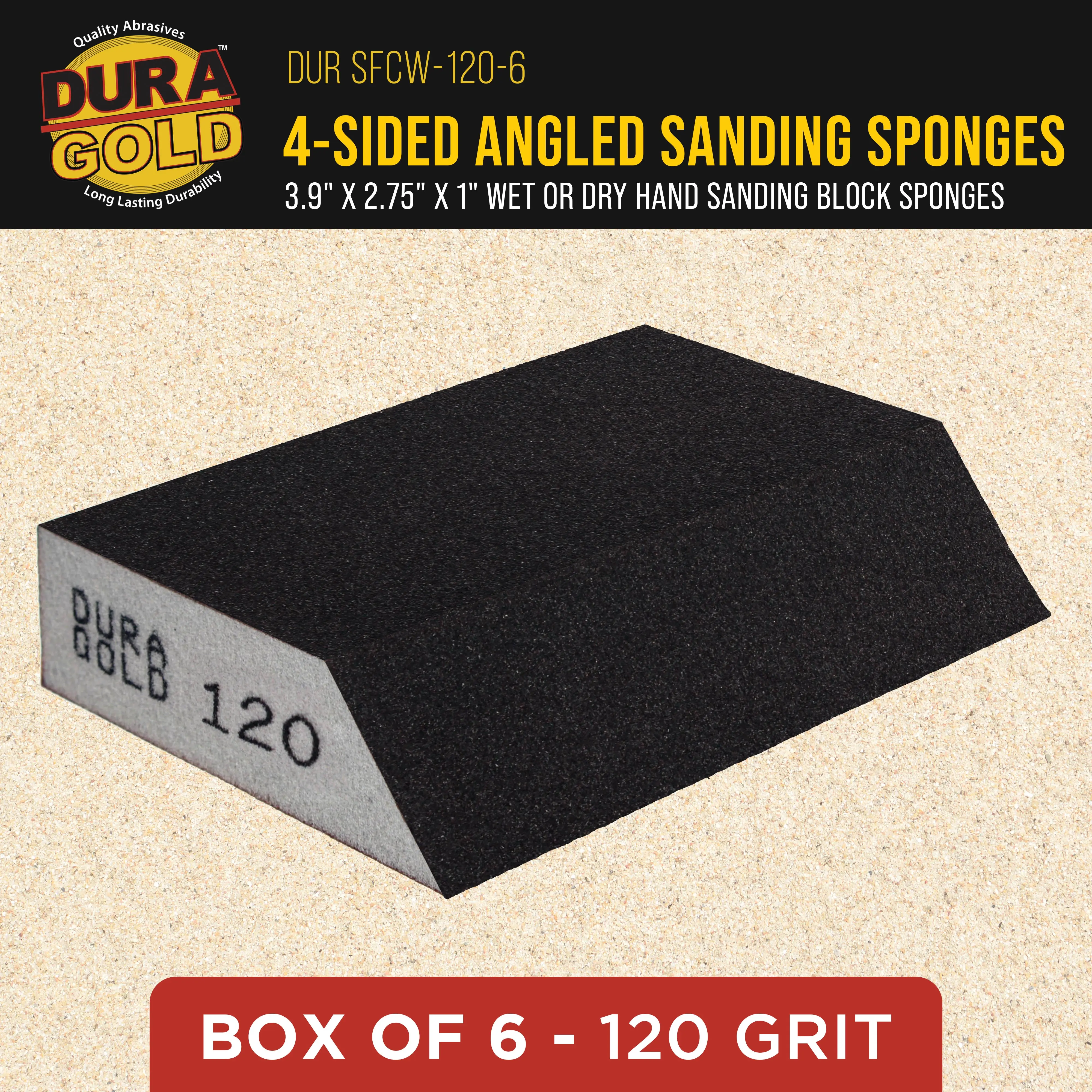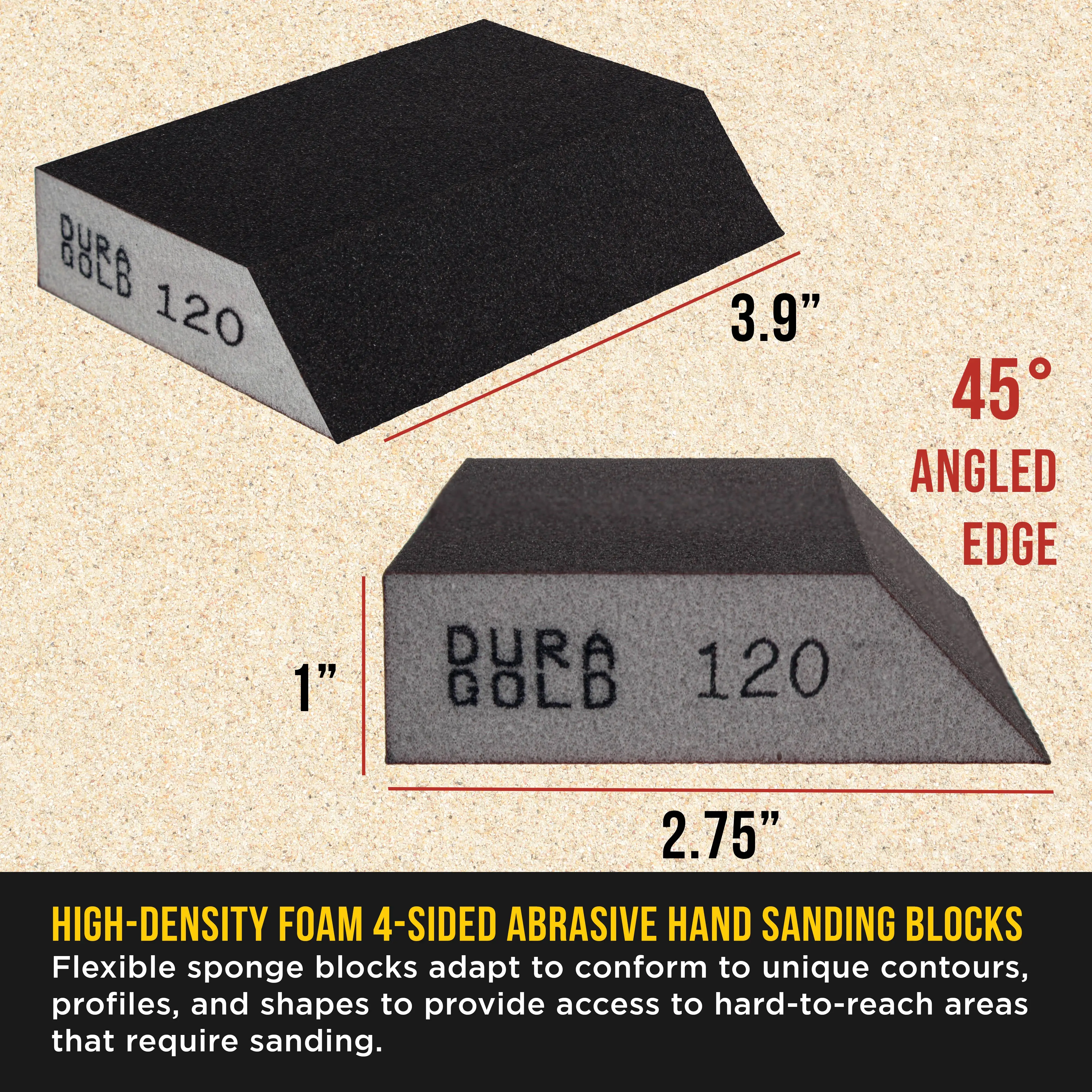 ·Box of 6 Dura-Gold Performance Flex 120-Grit Four-Sided Sanding Block Sponges with a 45-degree Angled Edge; 3.9" Long x 2.75" Wide x 1" Thick. High-performance, flexible, high-density foam hand sanding blocks with abrasive on all 4 sides. These 120-grit medium-cut abrasive sanding block pads are ideal for general sanding. The highly flexible sponge pads adapt to conform to unique contours, profiles, and shapes to provide access to tight, hard-to-reach areas that require sanding.
