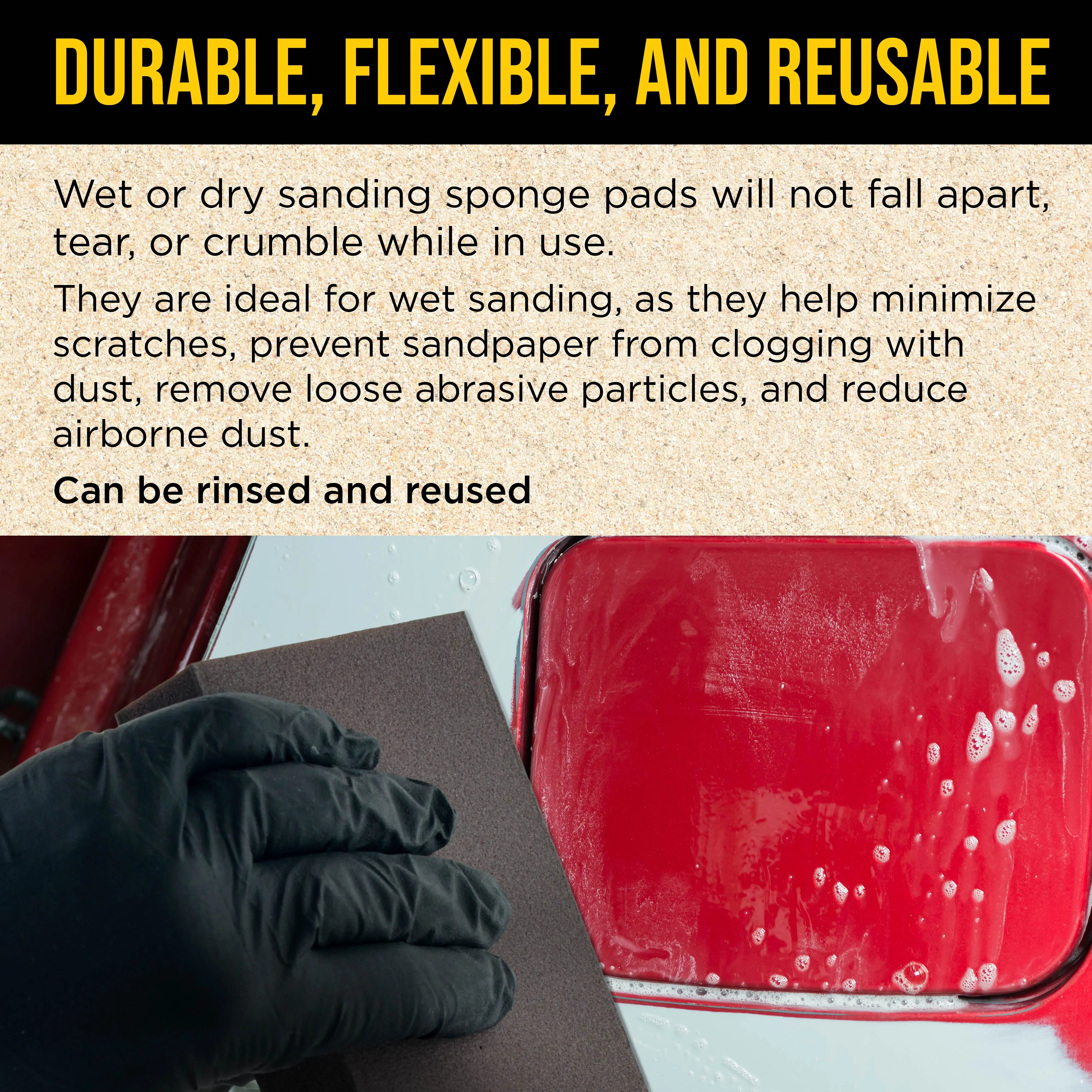 ·Durable, flexible, and highly elastic wet or dry sanding sponge pads that will not fall apart, tear, or crumble while in use; they can be rinsed and reused. They are ideal for wet sanding, as they help minimize scratches, prevent sandpaper from clogging with dust, remove loose abrasive particles, and reduce airborne dust. When hand sanding with the sponges, the soft foam backing distributes pressure evenly over surface pressure points for a uniform and consistent scratch.