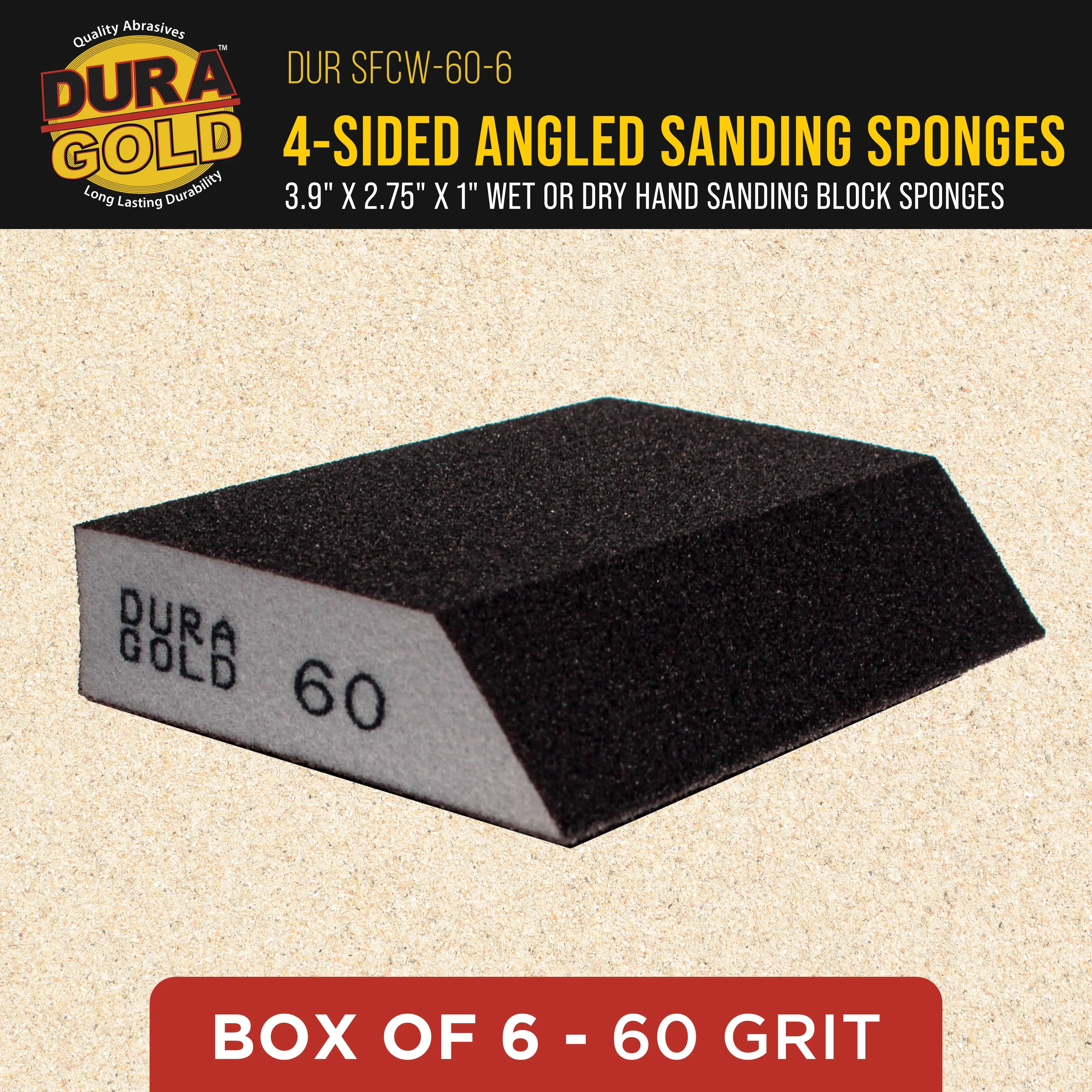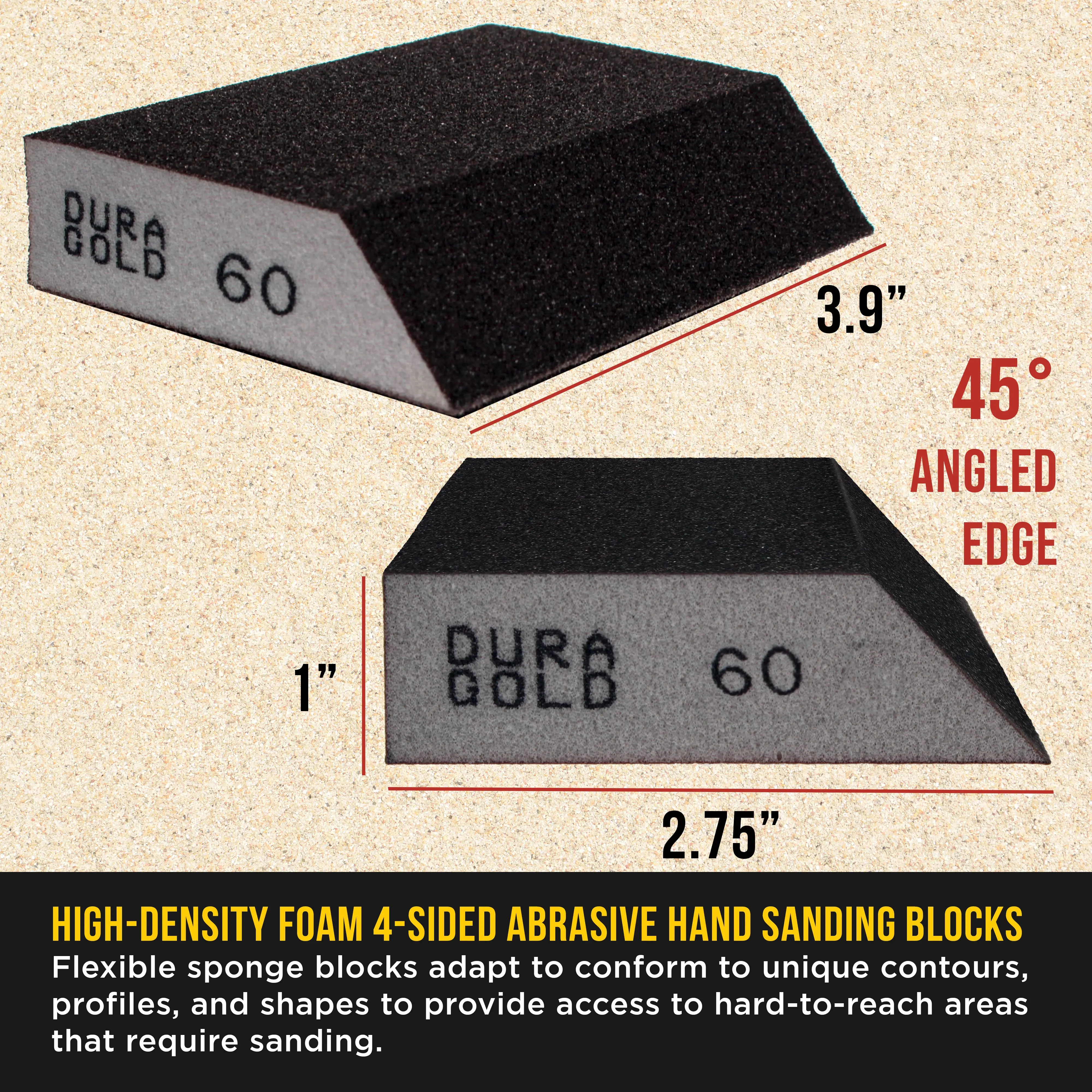 ·Box of 6 Dura-Gold Performance Flex 60-Grit Four-Sided Sanding Block Sponges with a 45-degree Angled Edge; 3.9" Long x 2.75" Wide x 1" Thick. High-performance, flexible, high-density foam hand sanding blocks with abrasive on all 4 sides. These 60-grit coarse-cut abrasive sanding block pads are ideal for aggressive sanding. The highly flexible sponge pads adapt to conform to unique contours, profiles, and shapes to provide access to tight, hard-to-reach areas that require sanding.