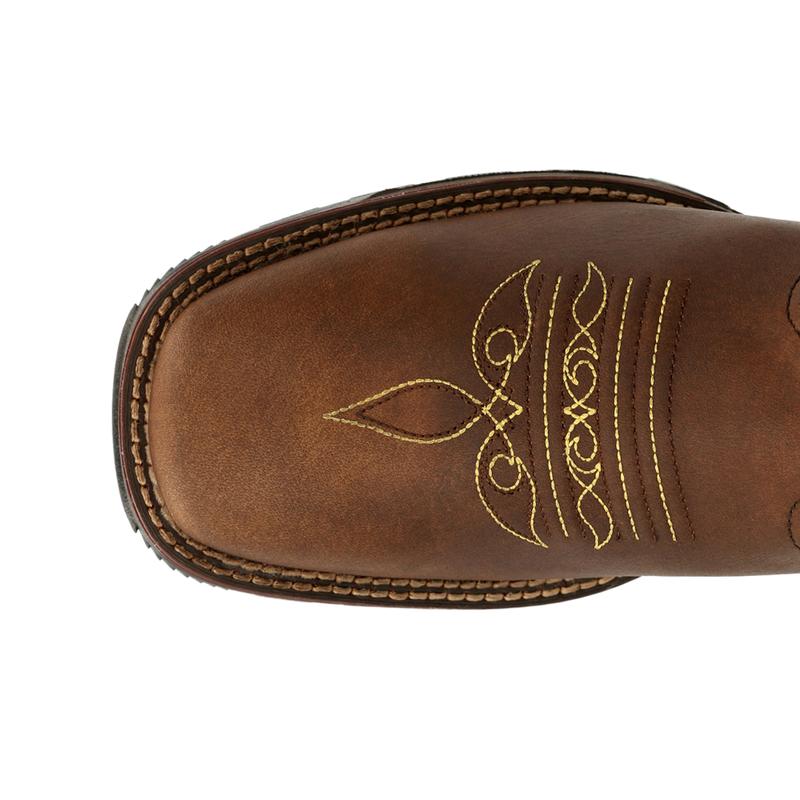 This is the women's 10" Western Waterproof Steel Toe Rugged Tan Durango Maverick. This style is full-grain leather with a faux shaft, has a soft mesh lining, waterproof membrane bootie construction and the Durango X-Pand System which is a hidden gore expansion for universal fit and easy on/off. It also includes the Durango X-Treme Comfort Footbed with memory foam for all day comfort and support. This style also features a fiberglass shank which provides lightweight stability and the rolled shank area allows easy placement in the stirrup. The style is finished off with a slip and oil-resistant rubber outsole, single row sole stitch, 1 1/8" rocker heel and square toe.