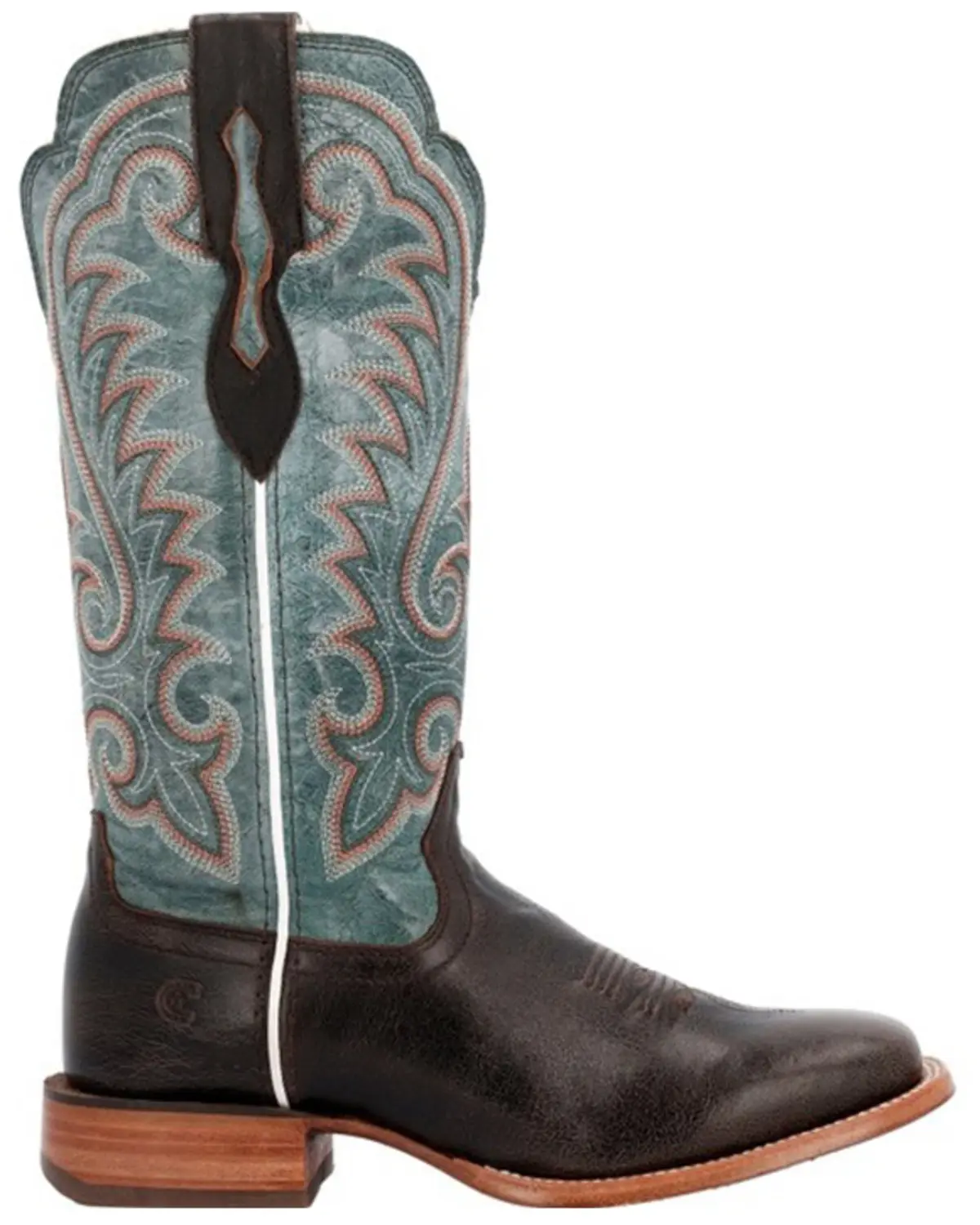 Broad square toe. Pull tabs with inlay. Brown full-grain leather vamp with western stitching. Full-grain leather shaft with multicolor accent western embroidery design. Stockman heel. 13" shaft height. Double-stitched 3/4 Goodyear® welt construction. High-abrasion resistant rubber heel lift. Imported.