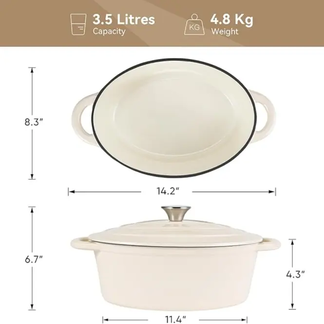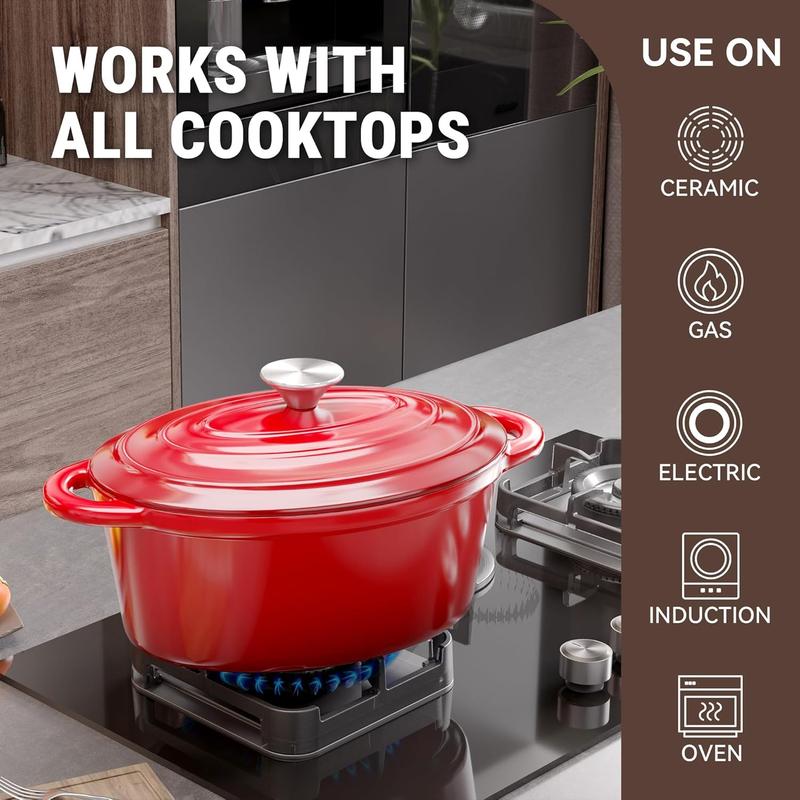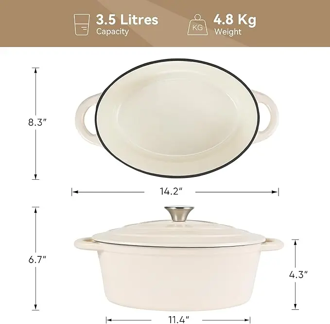 ·LARGE 4.5-QT CAPACITY: The oval dutch oven with a diameter of 11.4 inches and a capacity of 3.5 liters meets all the needs of daily stewing, don't worry about even family gatherings. It can be used in various cooking methods, such as stewing, cooking, baking, etc.The highest temperature tolerance is as high as 500°F.