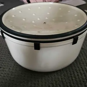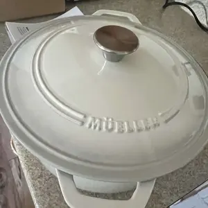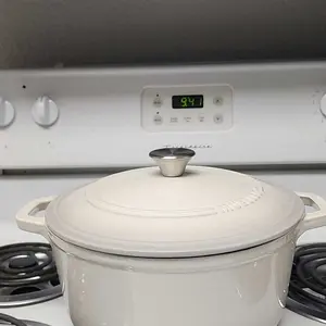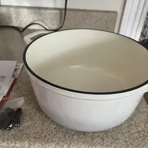 Ordered white and got a crème color, this clashes with my white cabinets. Plus there are a few scuff marks and a yellow stain on the bottom and white crusty stuff around the black park of the lid. Must have been used then returned. I would’ve ordered the red if I knew I wasn’t getting white.