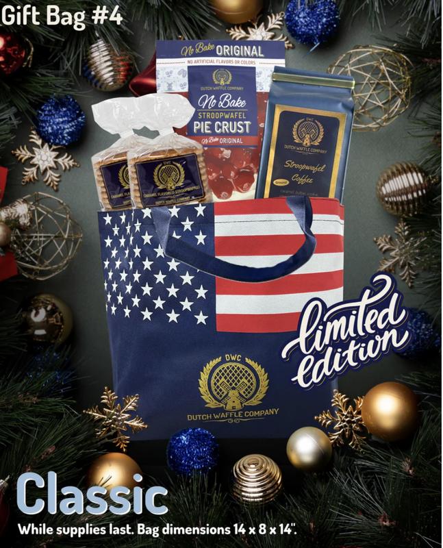 5. Dutch Waffle Company Classic Christmas Gift Bag Limited Edition 14x8x14 inches Festive American Flag Design