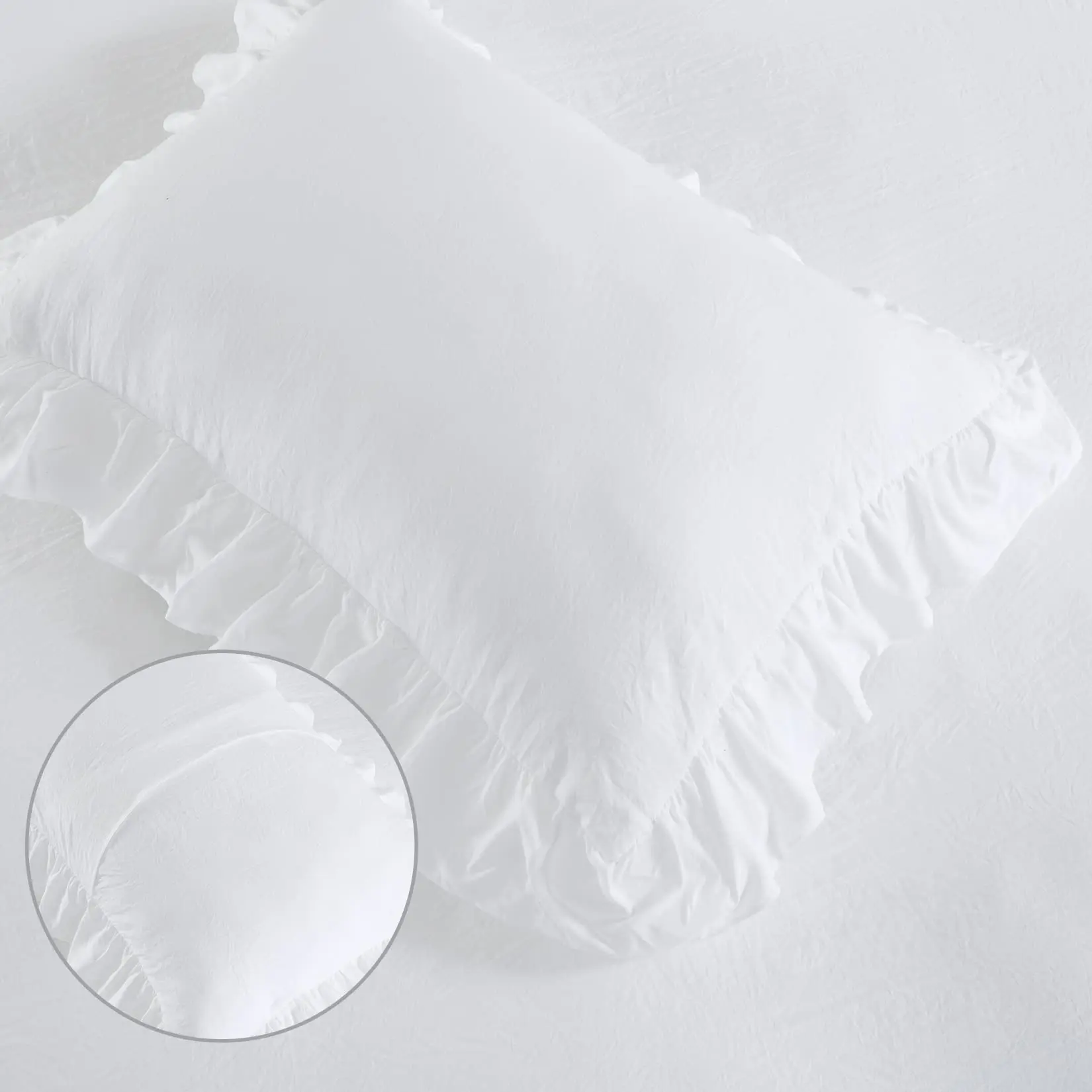 The Ruffled Design Washed Microfiber Duvet Cover Set offers a simple vintage update to your bedroom decor. Features ruffled fringe on 3 edges of the duvet cover and 4 edges of the pillow sham that add style and charm for a cute and cozy look. Crafted from a soft and breathable microfiber fabric with naturally wrinkled texture to keep you feeling cozy and comfy all year round. This bedding duvet cover set is great for everyday use.