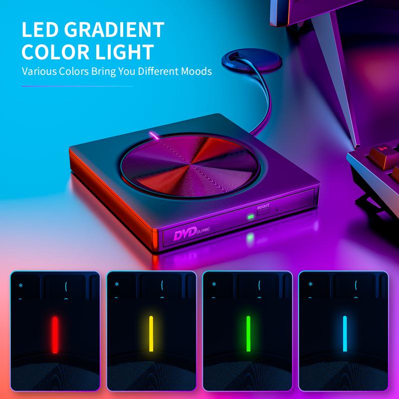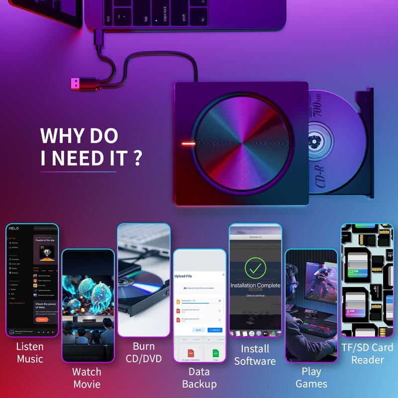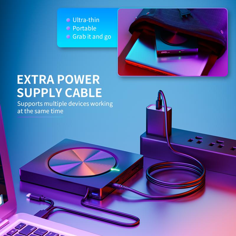 ·【Versatile Connectivity】: Equipped with high-speed USB 3.0 and Type-C interfaces, our DVD player for laptop ensures lightning-fast data transfer speeds of up to 5 Gbps. Enjoy stable performance without subsequent latency, whether you're burning discs or playing music and movies. Additionally, the drive features independent SD/TF card slots, 2 USB-A ports (2.0/3.0), and 2 USB-C ports (5 Gbps), offering versatile connectivity options for enhanced functionality