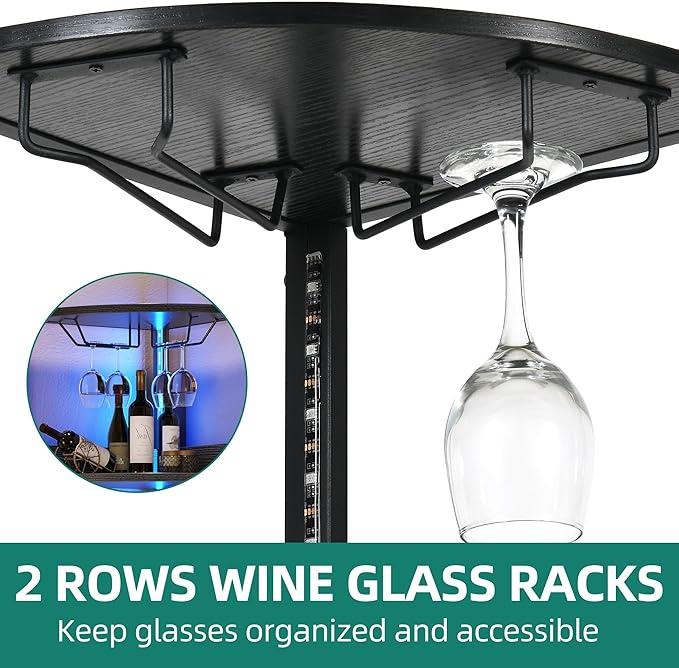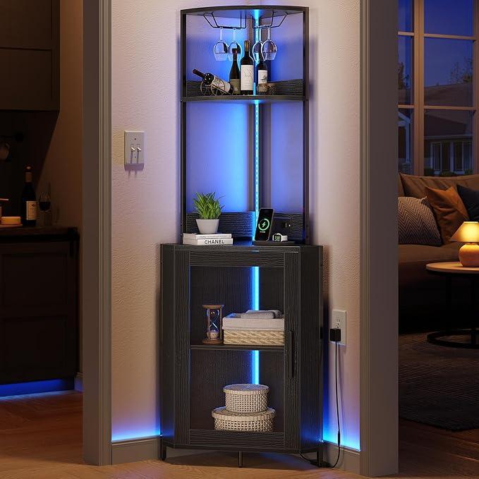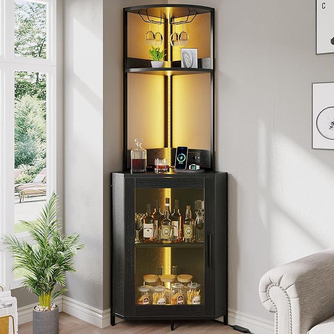 5. DWVO Corner Wine Cabinet with Power Outlets & LED Lights, Corner Bar Cabinet with Glass Holder, Liquor Bar Rack Cabinet for Living Room, Dining Room, Kitchen, Black