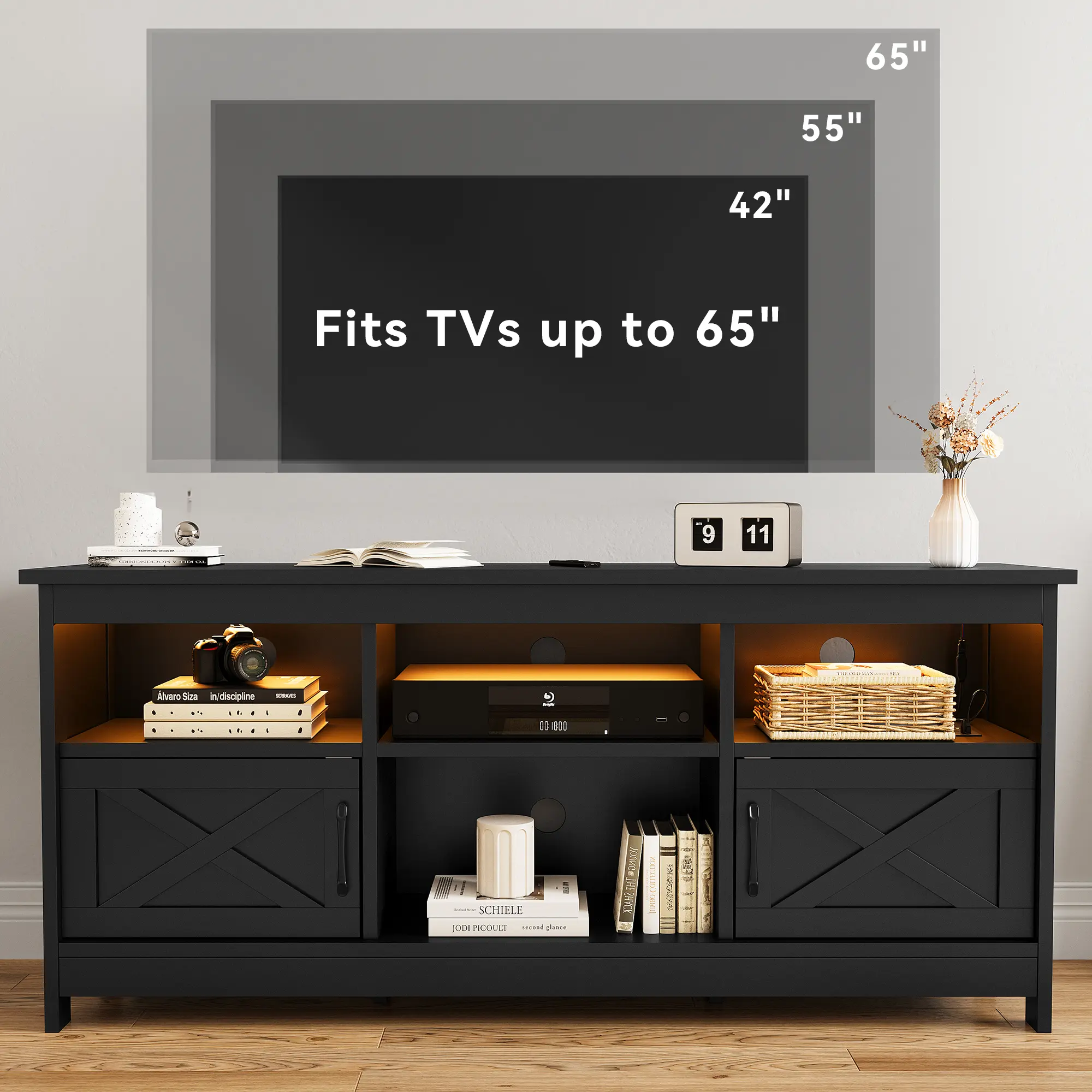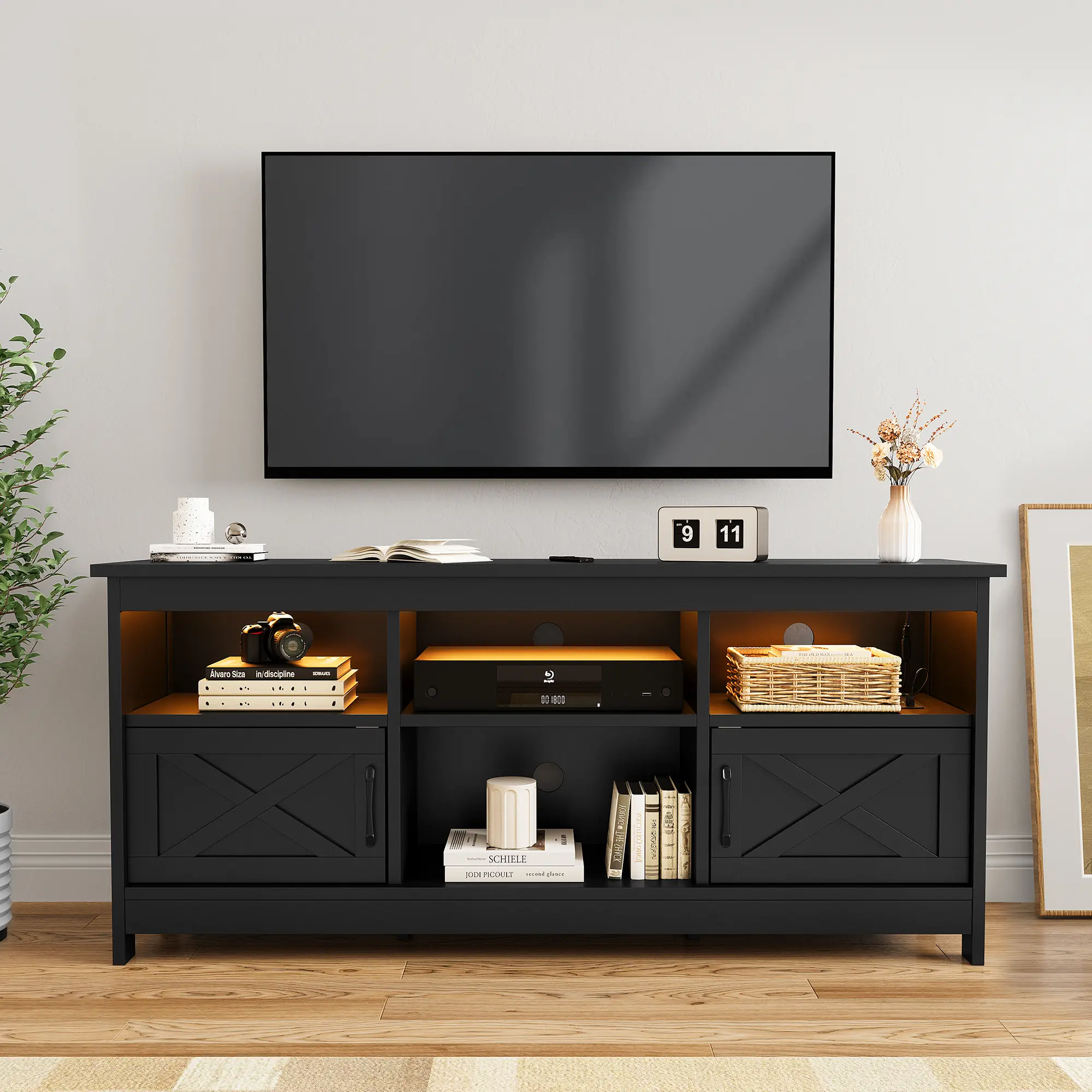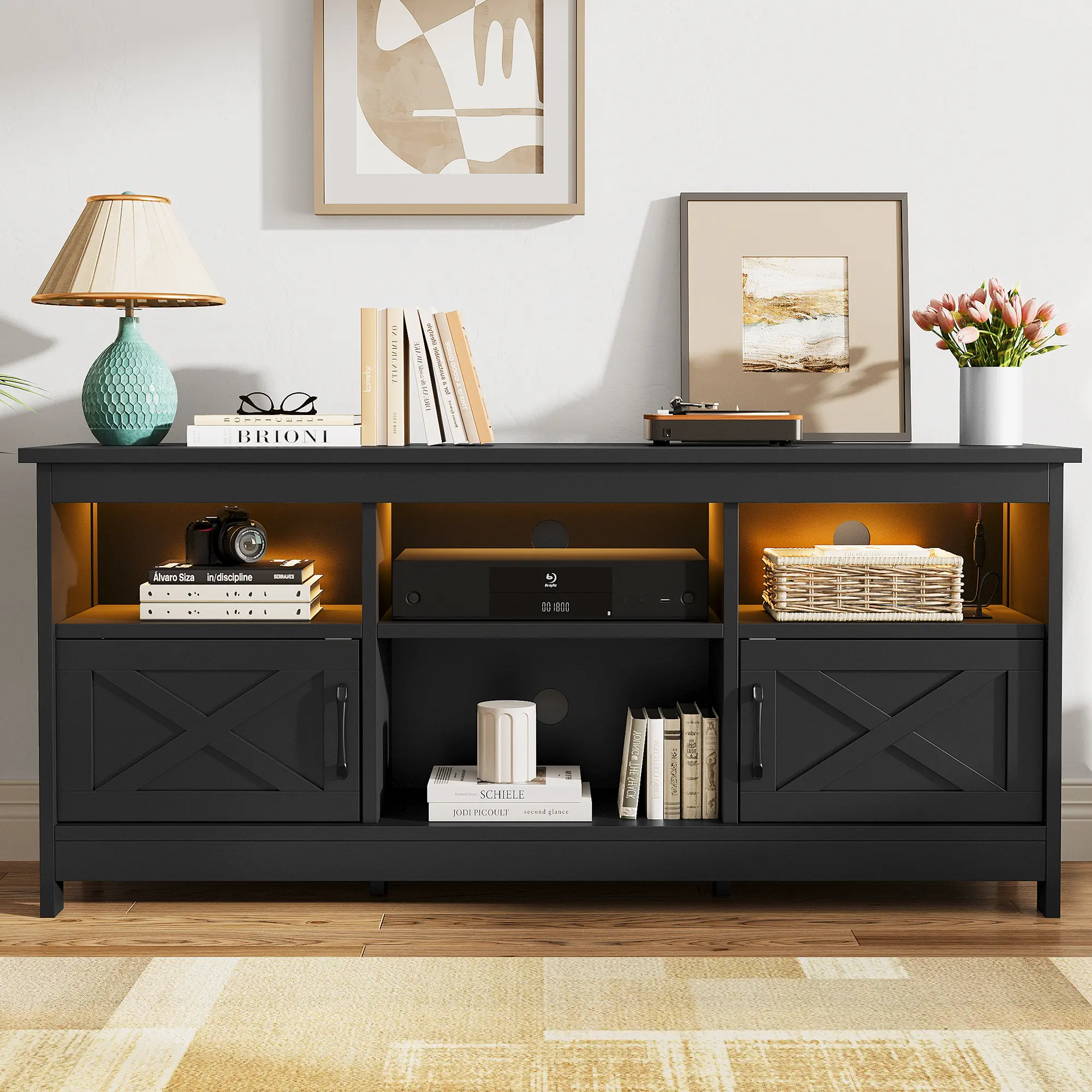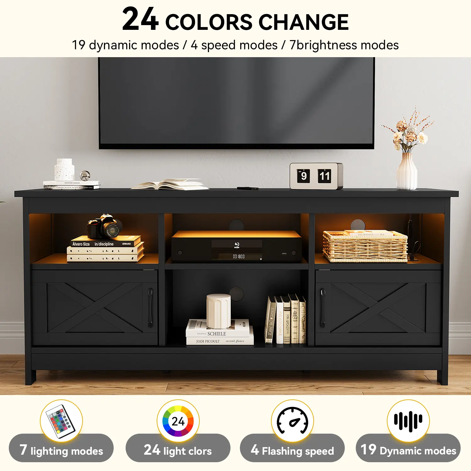 --LED Light Entertainment Center: Enhance your TV viewing experience and entertainment ambiance with this TV stand; the integrated LED light strips are available in a variety of colors to create a dynamic atmosphere that matches your mood.