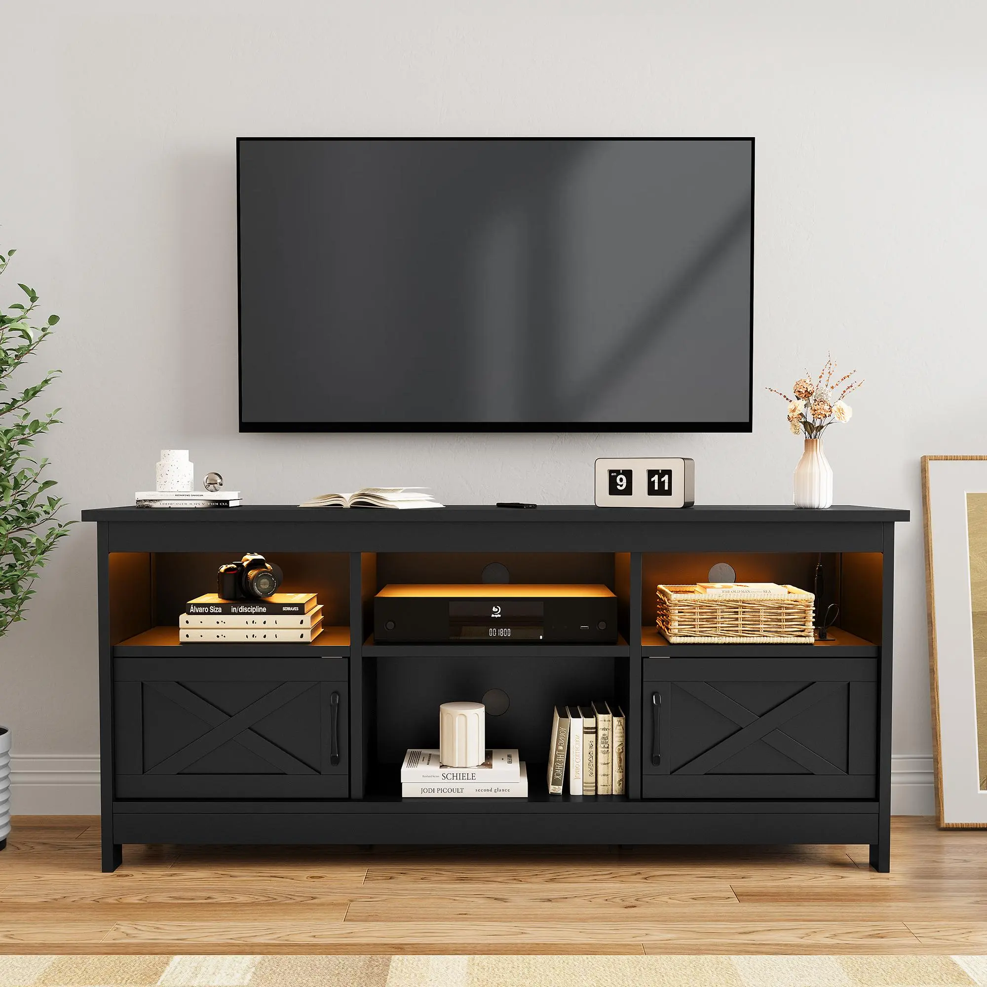 --TV Media Console Shelf with Power Outlet and USB Ports: This TV cabinet shelf with power outlet features 2 built-in USB ports and 4 standard plug sockets to accommodate a variety of devices, making it easy to charge TVs, DVDs, WiFi routers and more.