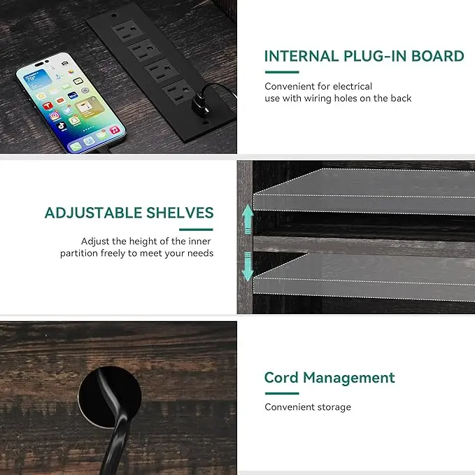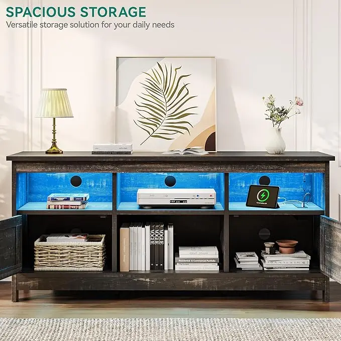 Adjustable Features: This TV stand is designed with adjustable shelves for personalized storage; It also includes 4 three-prong outlets and 2 USB ports, providing convenient power access for your devices