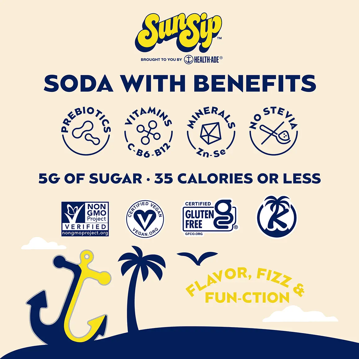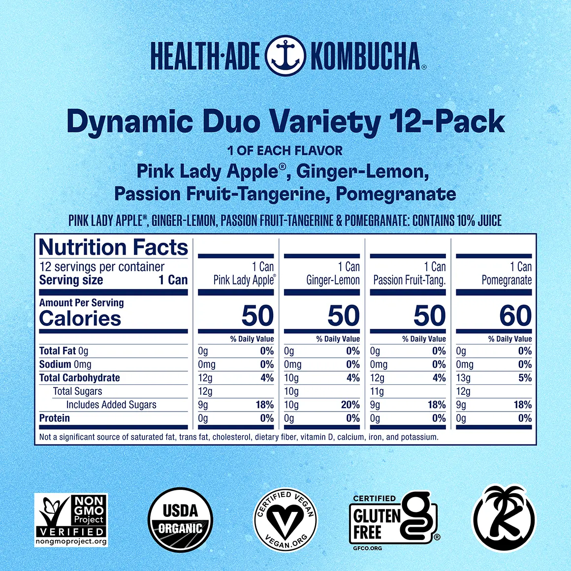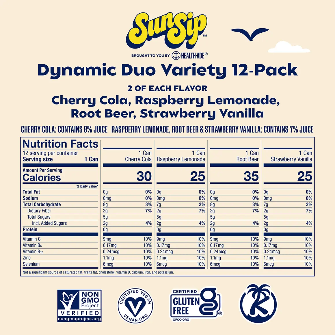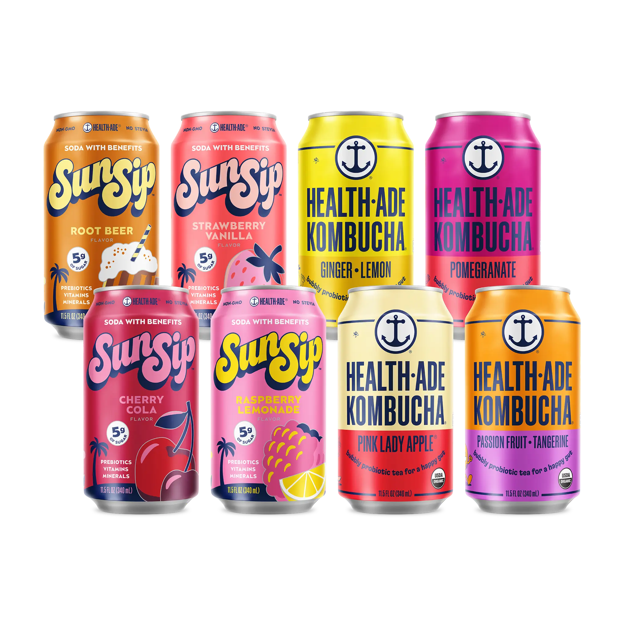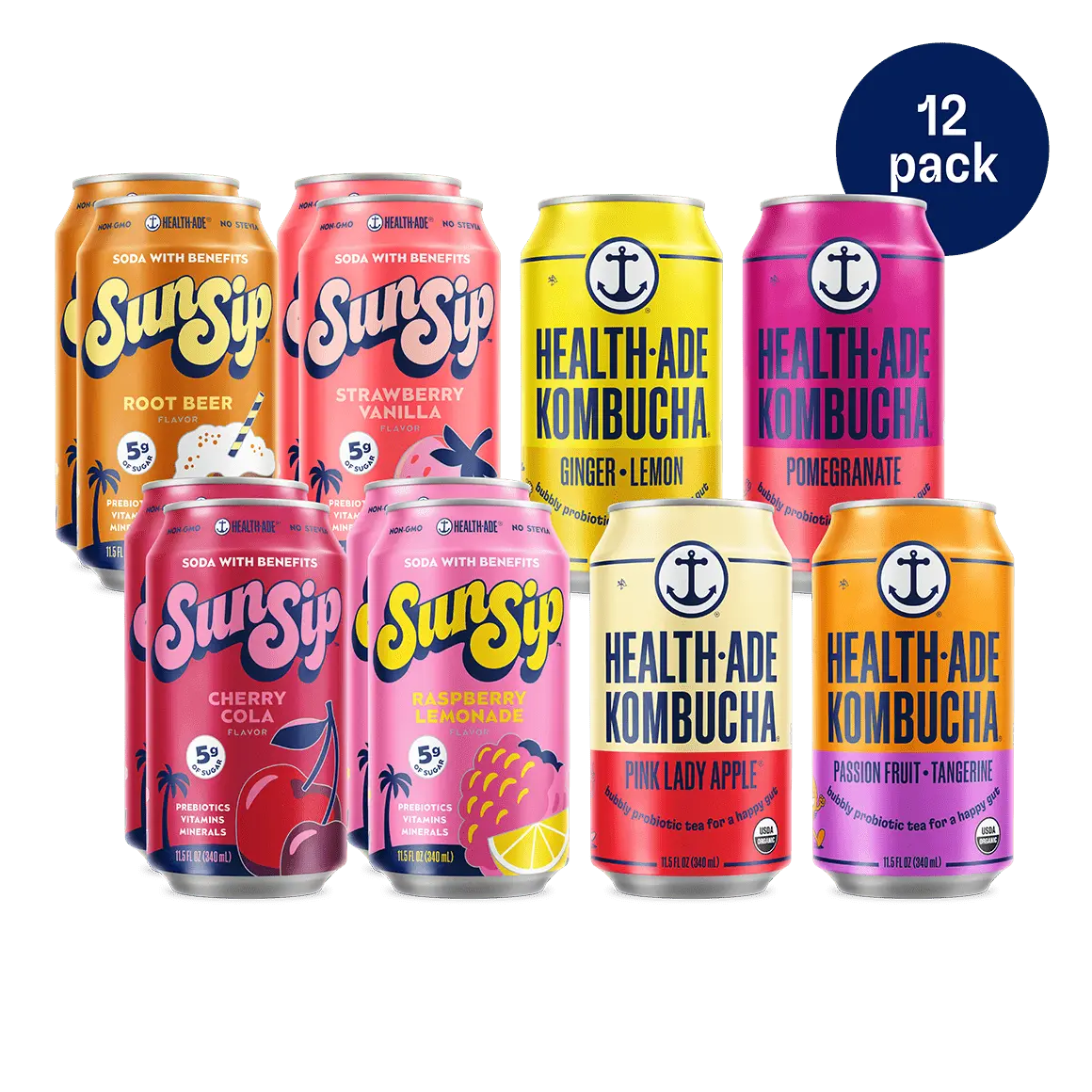 Our new variety pack features classic Health-Ade Kombucha flavors alongside refreshing new SunSip flavors. Each 12-pack contains:- 2 cans each of SunSip (Cherry Cola, Raspberry Lemonade, Root Beer, Strawberry Vanilla)- 1 can each of Health-Ade Kombuchain cans (Pink Lady Apple, Ginger Lemon, Passion Fruit Tangerine, Pomegranate).