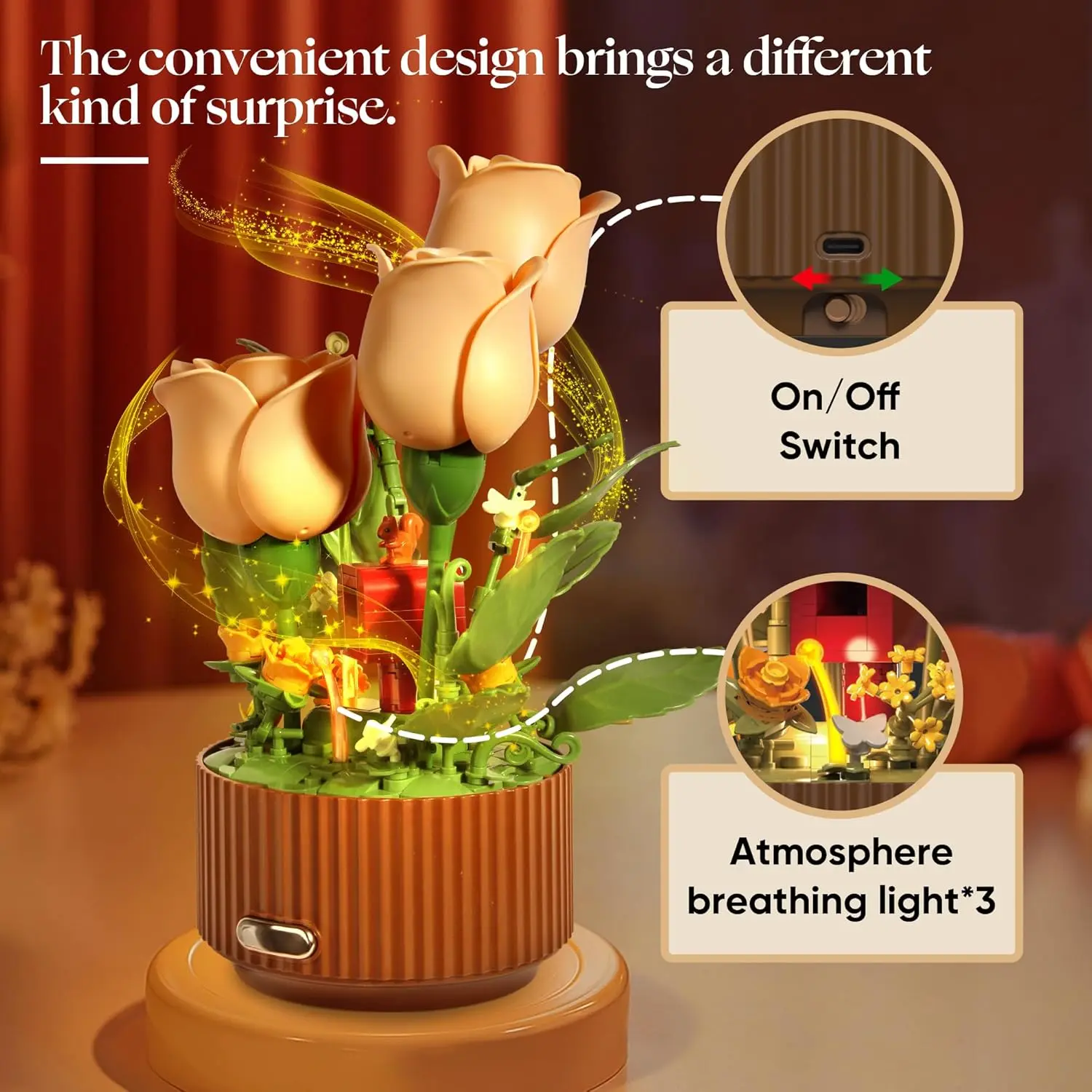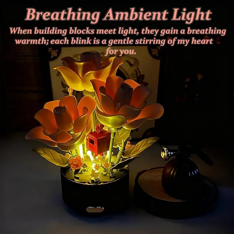 The flower is equipped with soft breathing LED lights that glow warmly while the petals move. This creates a dreamy ambiance at night, making it not only a creative building toy but also a beautiful decorative night light.