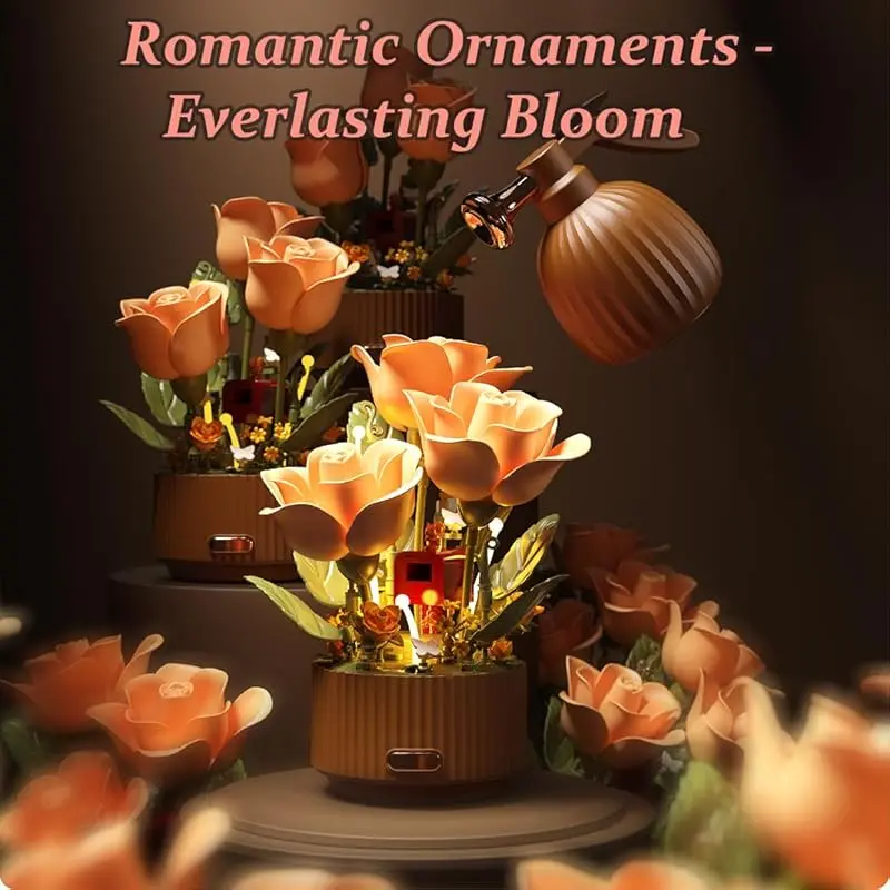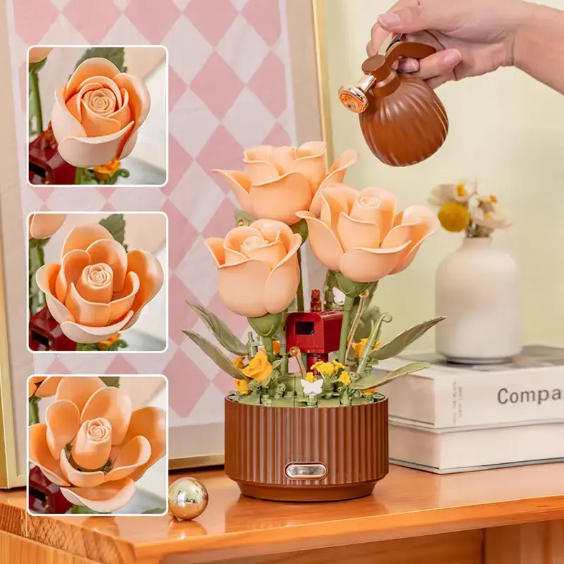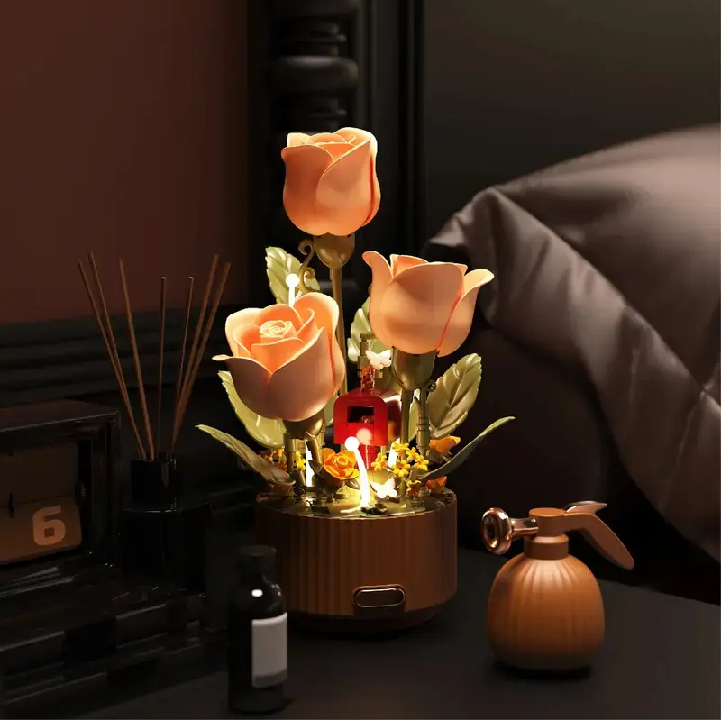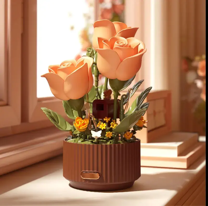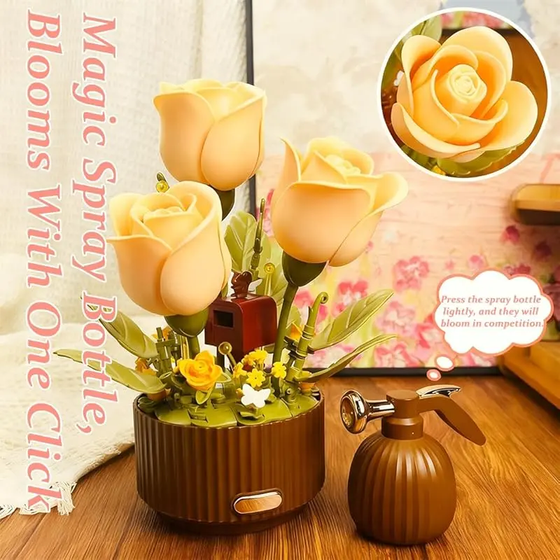 This electric flower bouquet building set features a motorized mechanism that brings the rose to life. Simply press the spray-bottle remote control or the button on the flowerpot base, and the petals will gracefully bloom and close automatically, transforming a simple building set into a living piece of kinetic art.