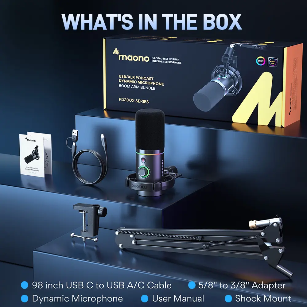 Dynamic Microphone*1 Shock Mount*1 + 2.5 m USB-C to USB-A/C Cable*1 + 5/8'' to 3/8'' Adapter*1+ User's Manual *1 (PS: The product package list is different according to the version you select)