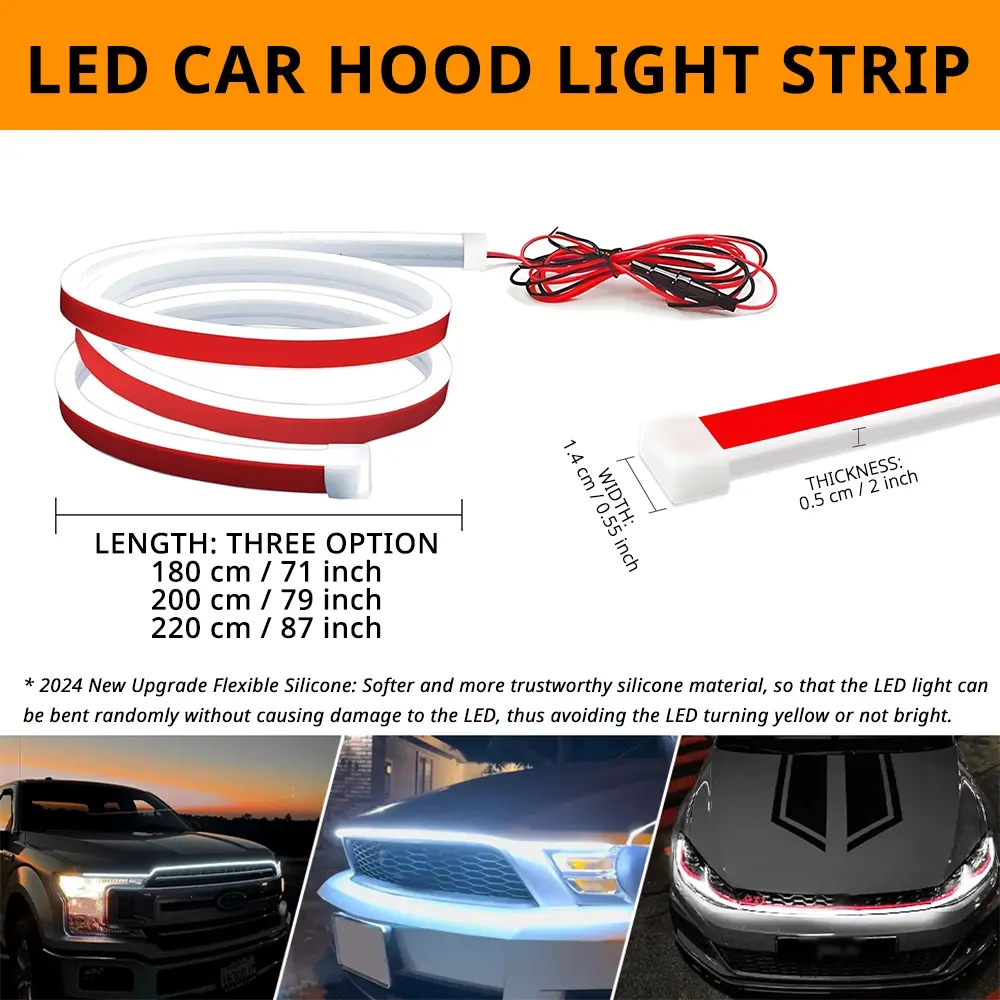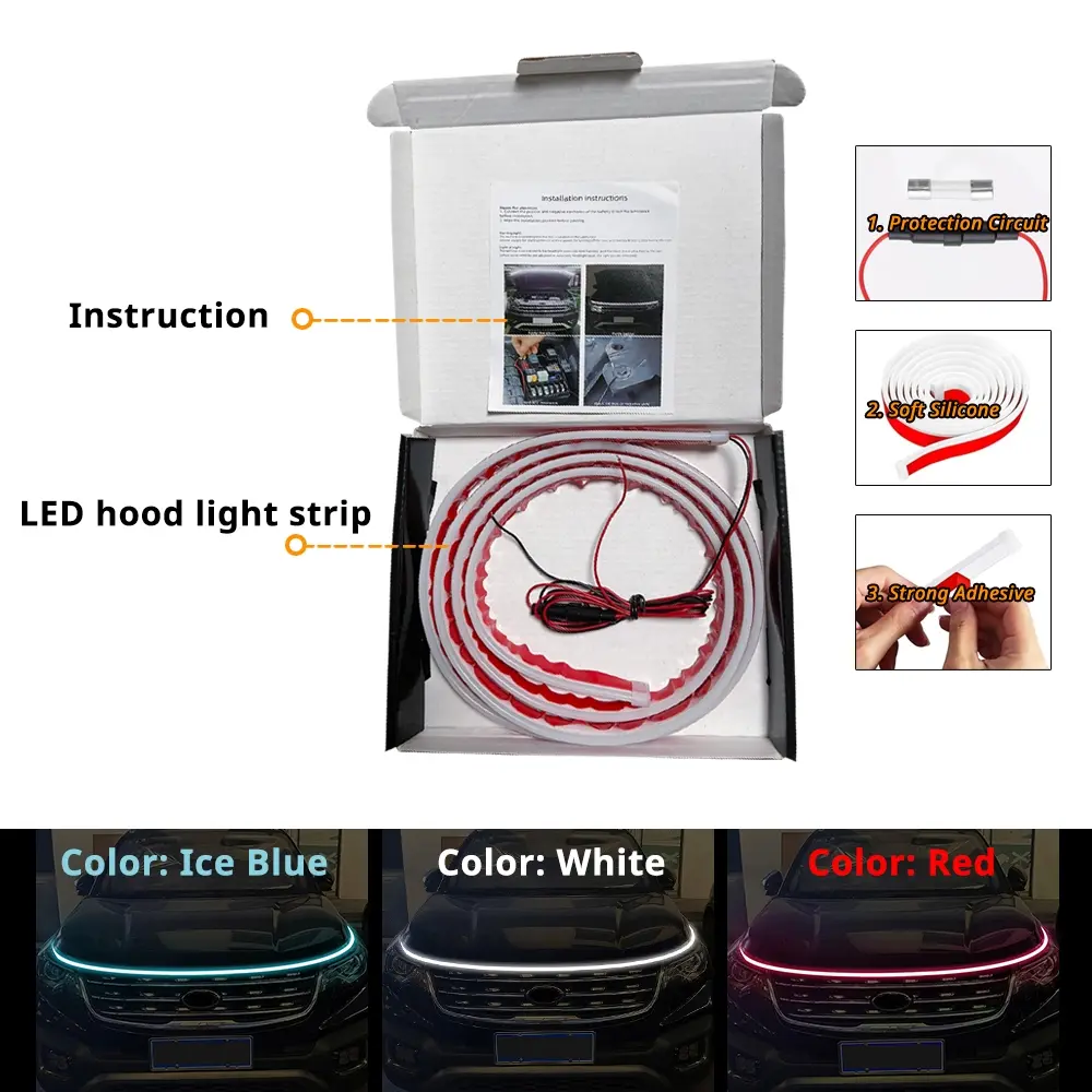 ·High-Quality Material: The hood light strip is made of silicone, non-heating elastic material. It can be bent at your will and has a long lifespan. Soft and safe.
