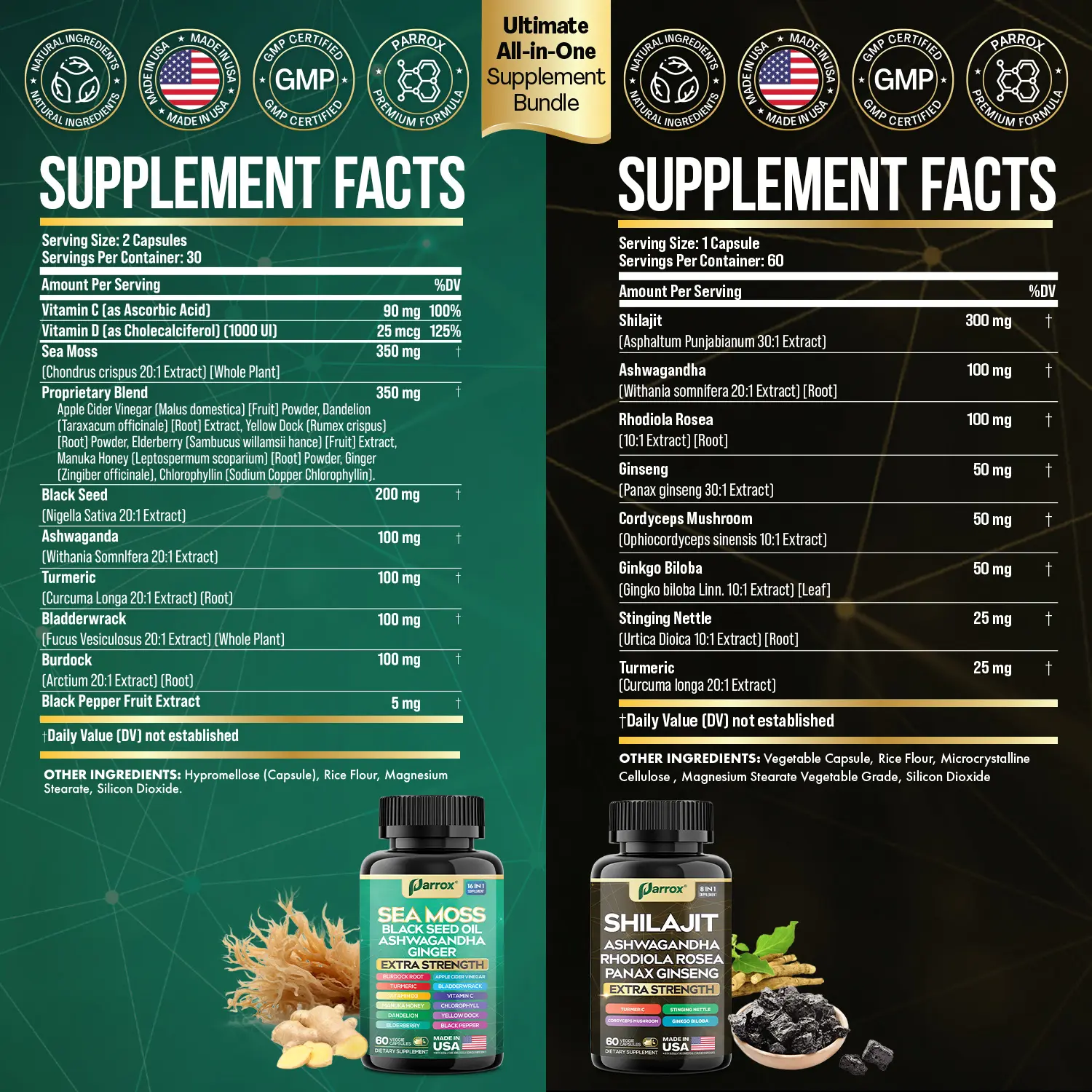 Get the Dynamic Vitality Bundle of Parrox Sea Moss Multivitamin & Shilajit Power Combo and experience the power of highly potent herbal ingredients for your overall wellness and energy.