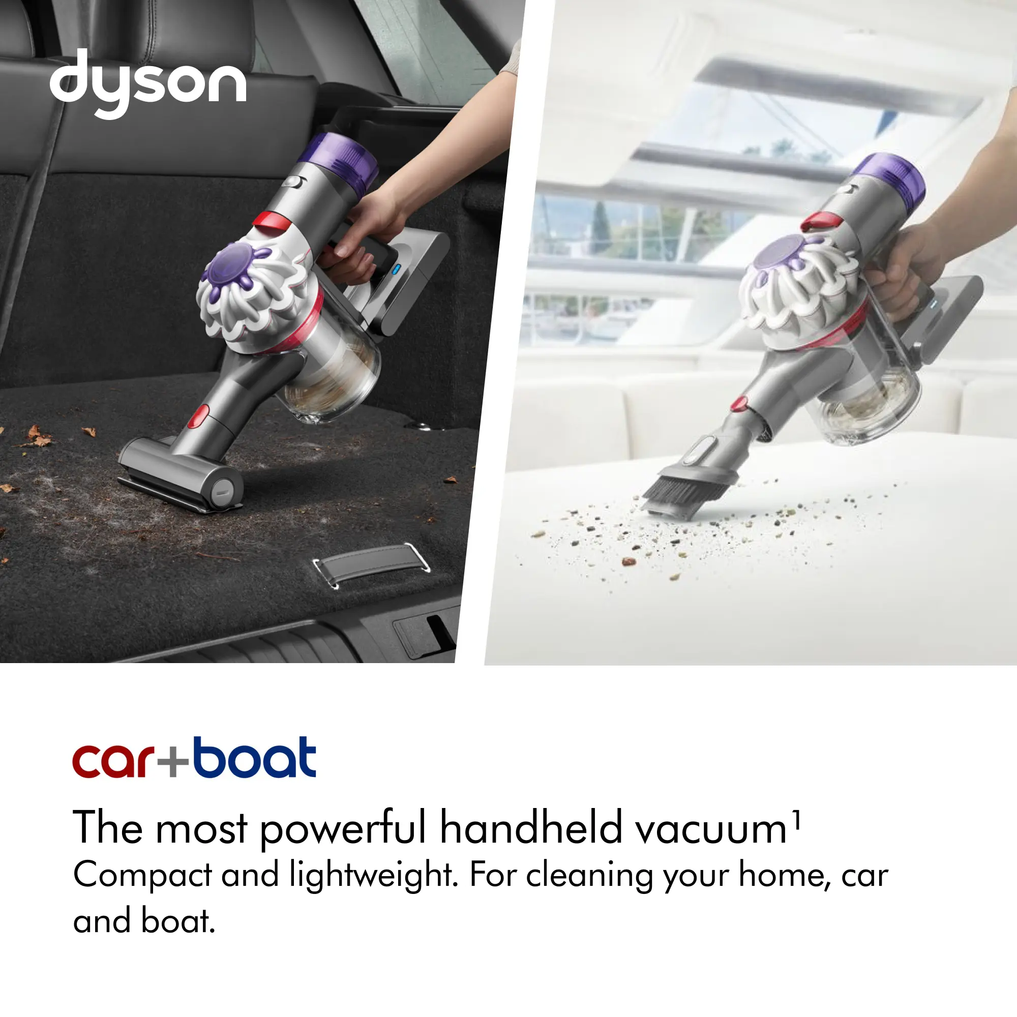 The Dyson Car+Boat cordless handheld vacuum is engineered with the power, versatility, and run time to deep clean your home, car or boat. Choose between three tools to remove debris and hair from hard surfaces, upholstery and tight spaces, both at home or on the go. As you clean, Dyson’s advanced filtration system captures and seals in allergens and fine dust.³