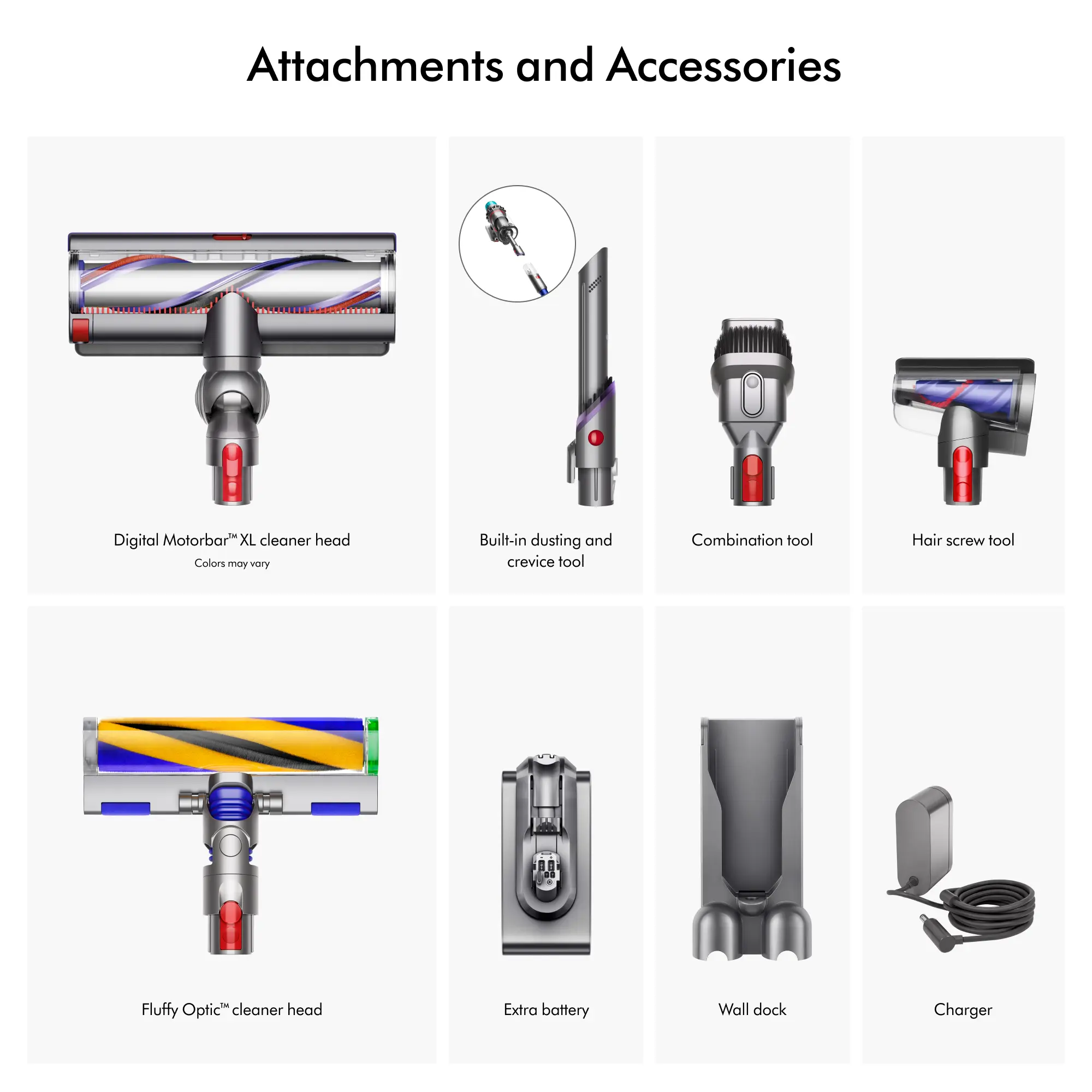 · Comes with 6 Dyson-engineered accessories to clean up high, down low, and everywhere in between. Includes the innovative Hair screw tool for removing long hair and pet hair from small spaces without tangles.