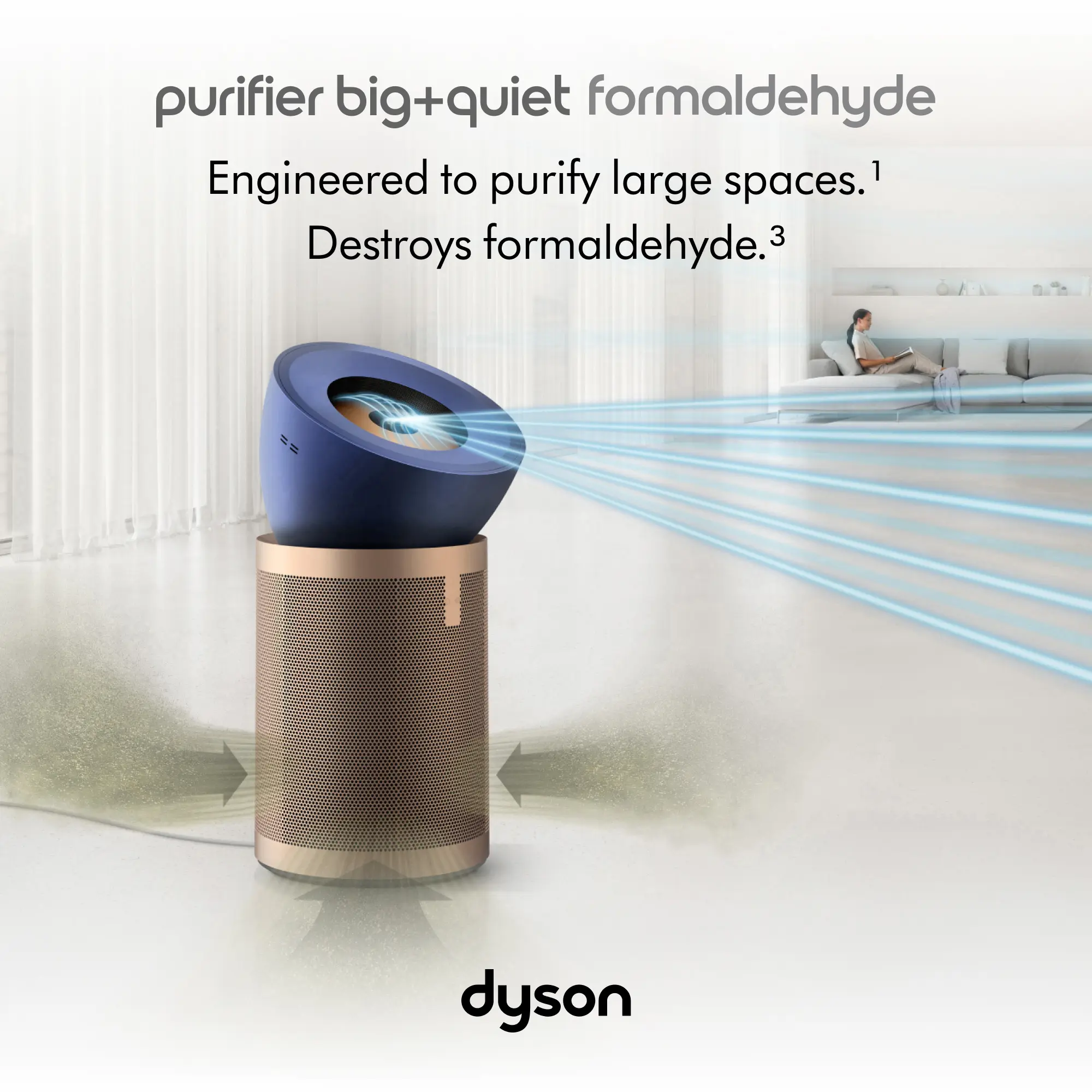 The Dyson Purifier Big+Quiet Formaldehyde is our biggest purifier yet, engineered from the ground up, to evenly purify large spaces.¹ Cone aerodynamics creates a condensed jet of air to project purified air over 32 feet. Quietly. An advanced 360 HEPA H13 grade filter captures allergens and 99.97% of fine particles.⁴ Removes gases and odors.² Destroys formaldehyde, permanently.³
