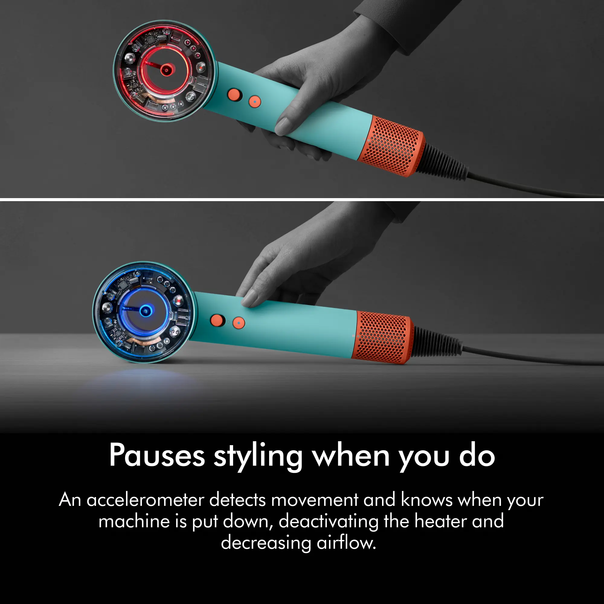 ·Pause detect knows when you’ve paused styling. When no motion is detected, the machine will automatically switch off the heater and reduce airflow. When it’s picked back up, it’s reactivated.