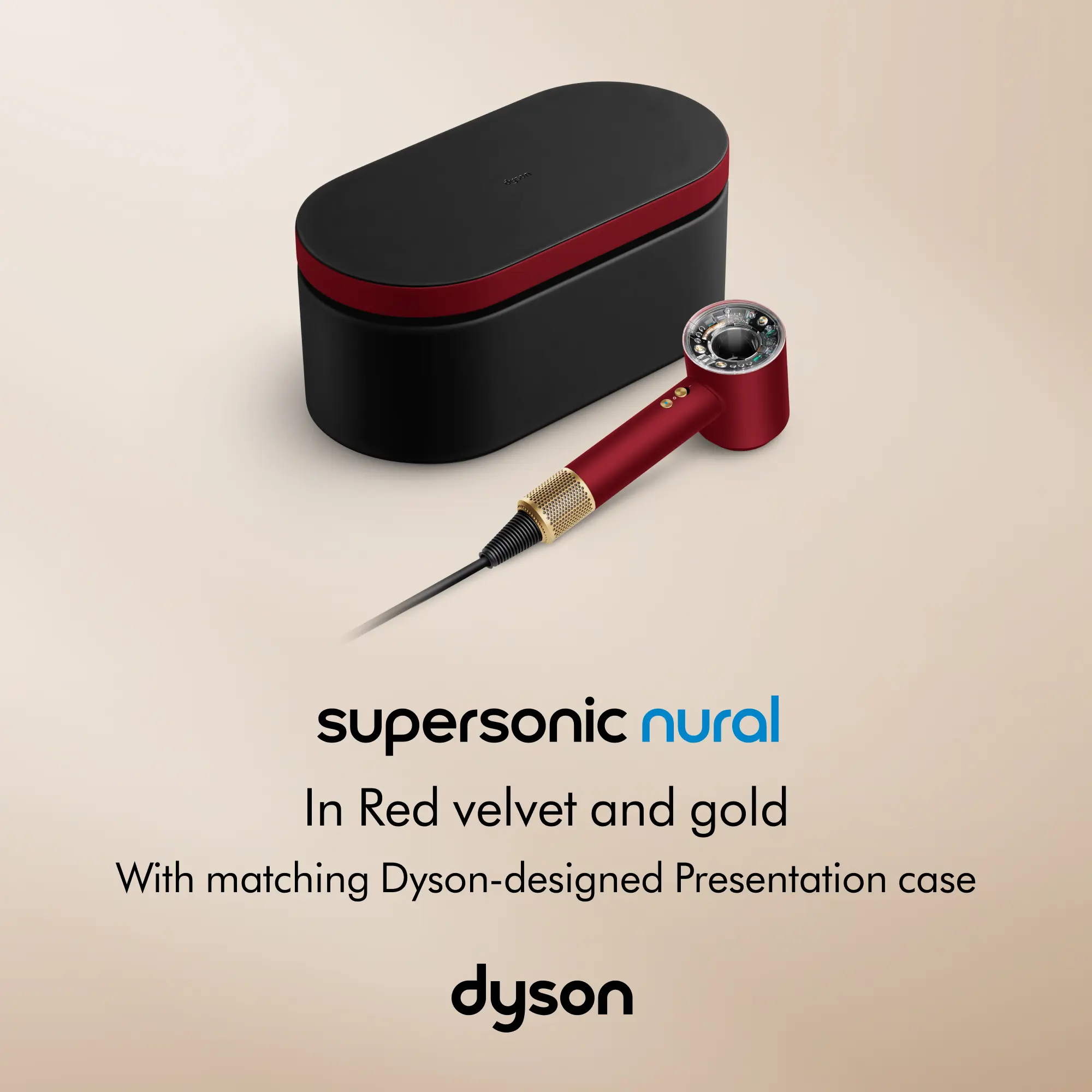 Special edition Dyson Supersonic Nural™ in Red velvet and Gold is inspired by Chinese pottery designs, with a luxurious velvet finish. This set includes a complimentary Presentation case. A network of Nural™ sensors automatically adjusts airflow and temperature to enhance natural shine and protect scalp health.¹