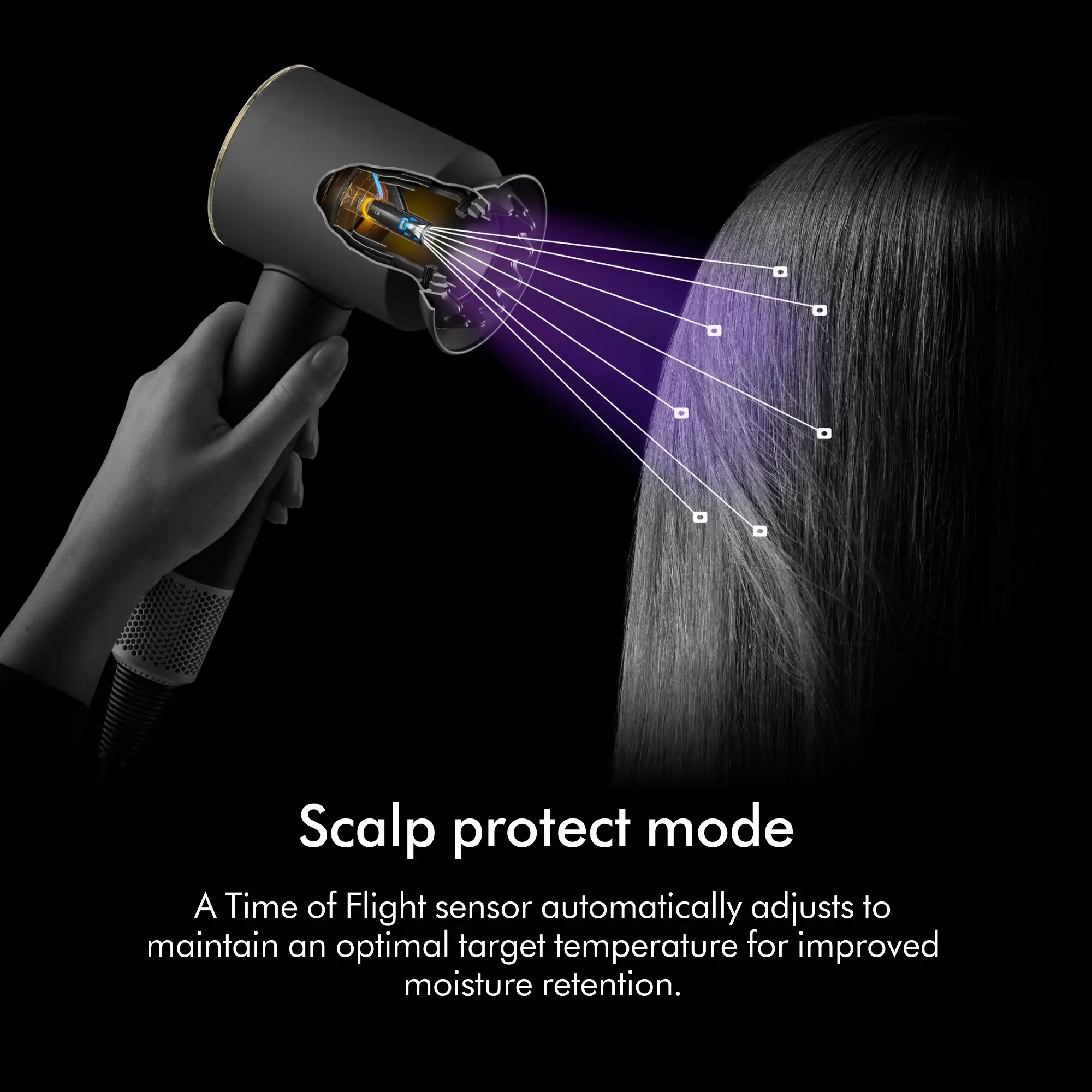 ·Scalp protect mode automatically adjusts air temperature to maintain an optimal target temperature of 130°F at the scalp for comfortable, close-up drying.²