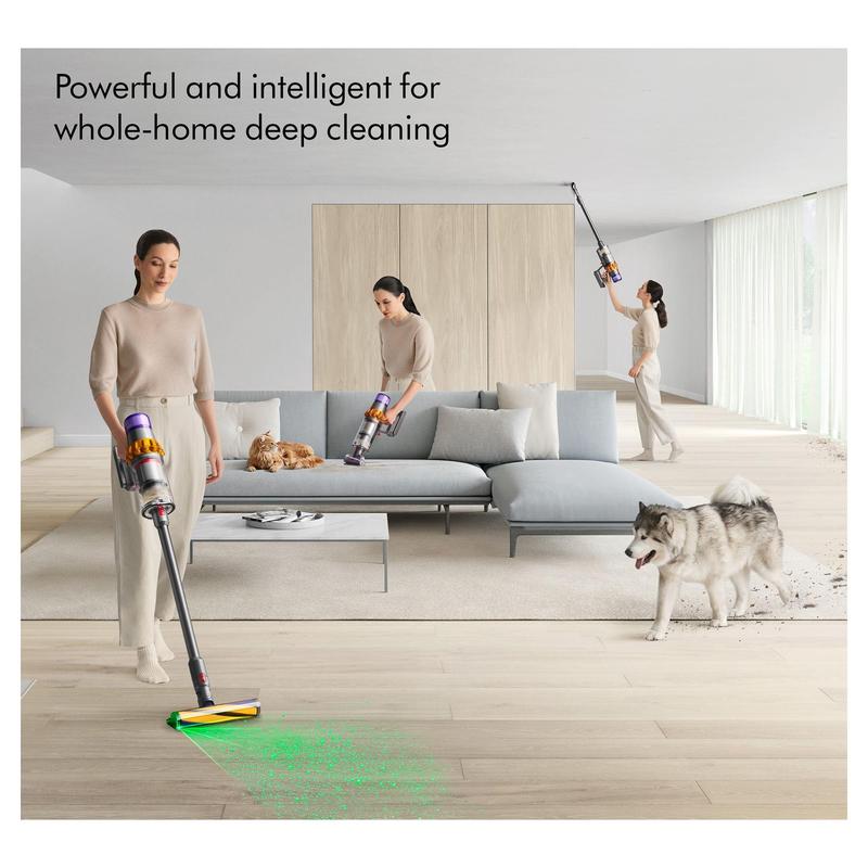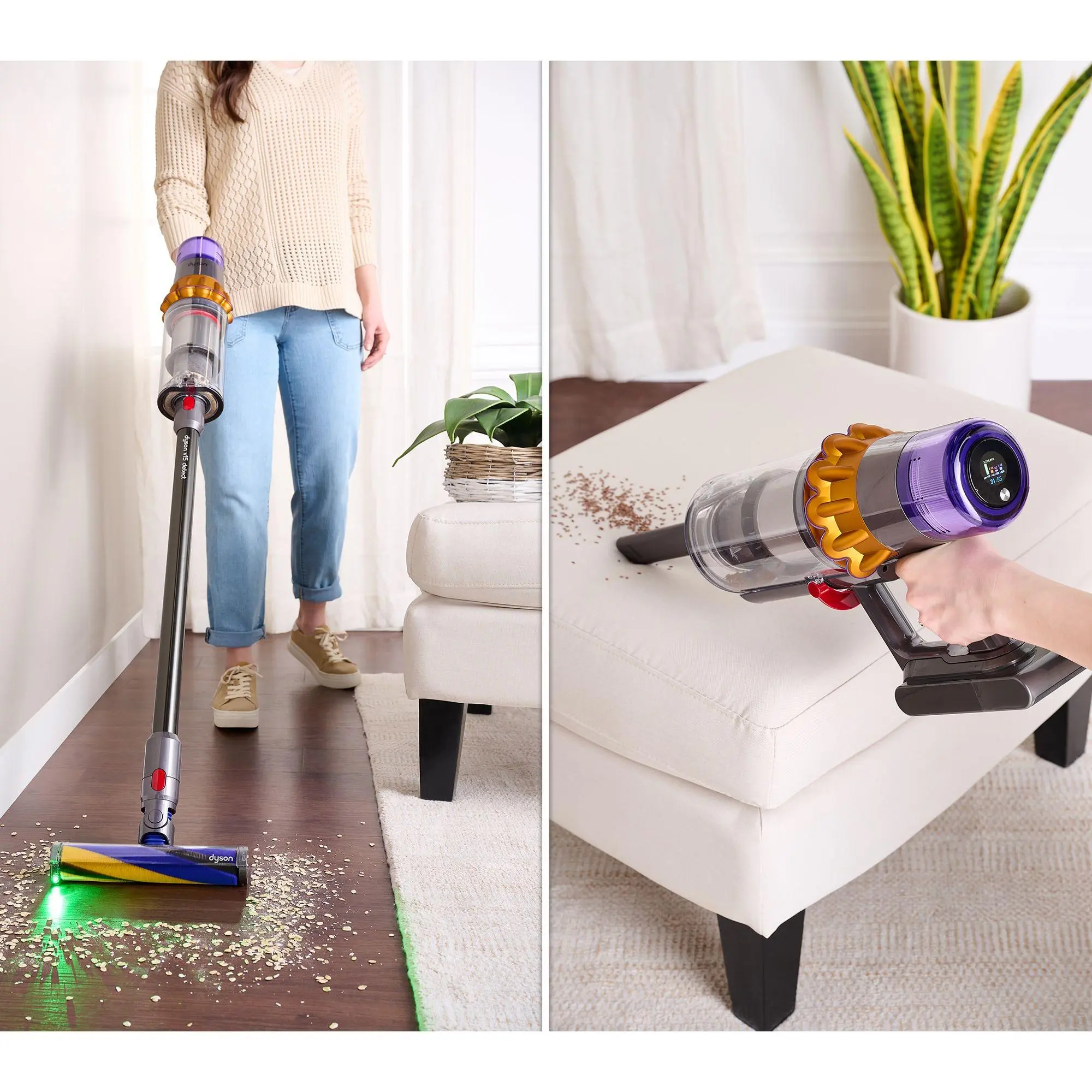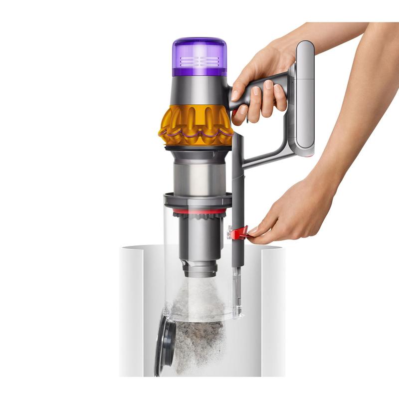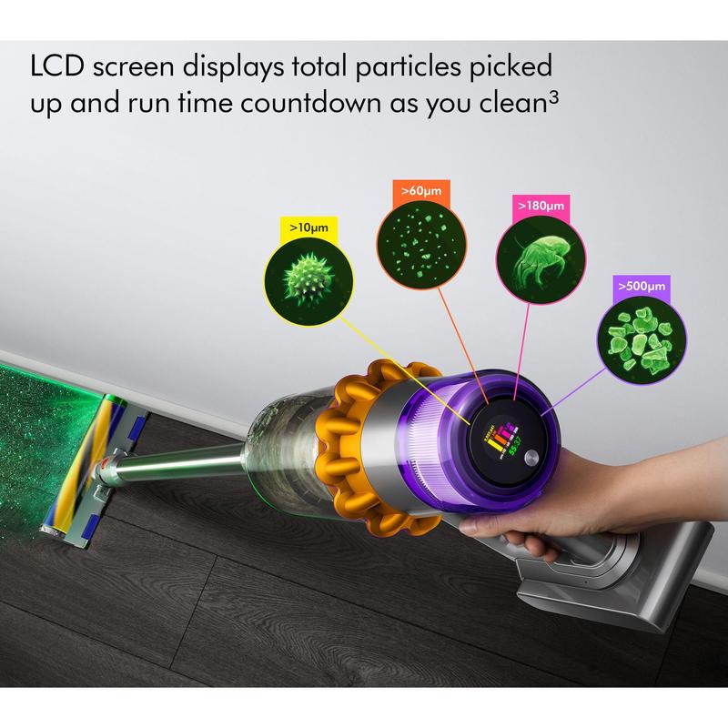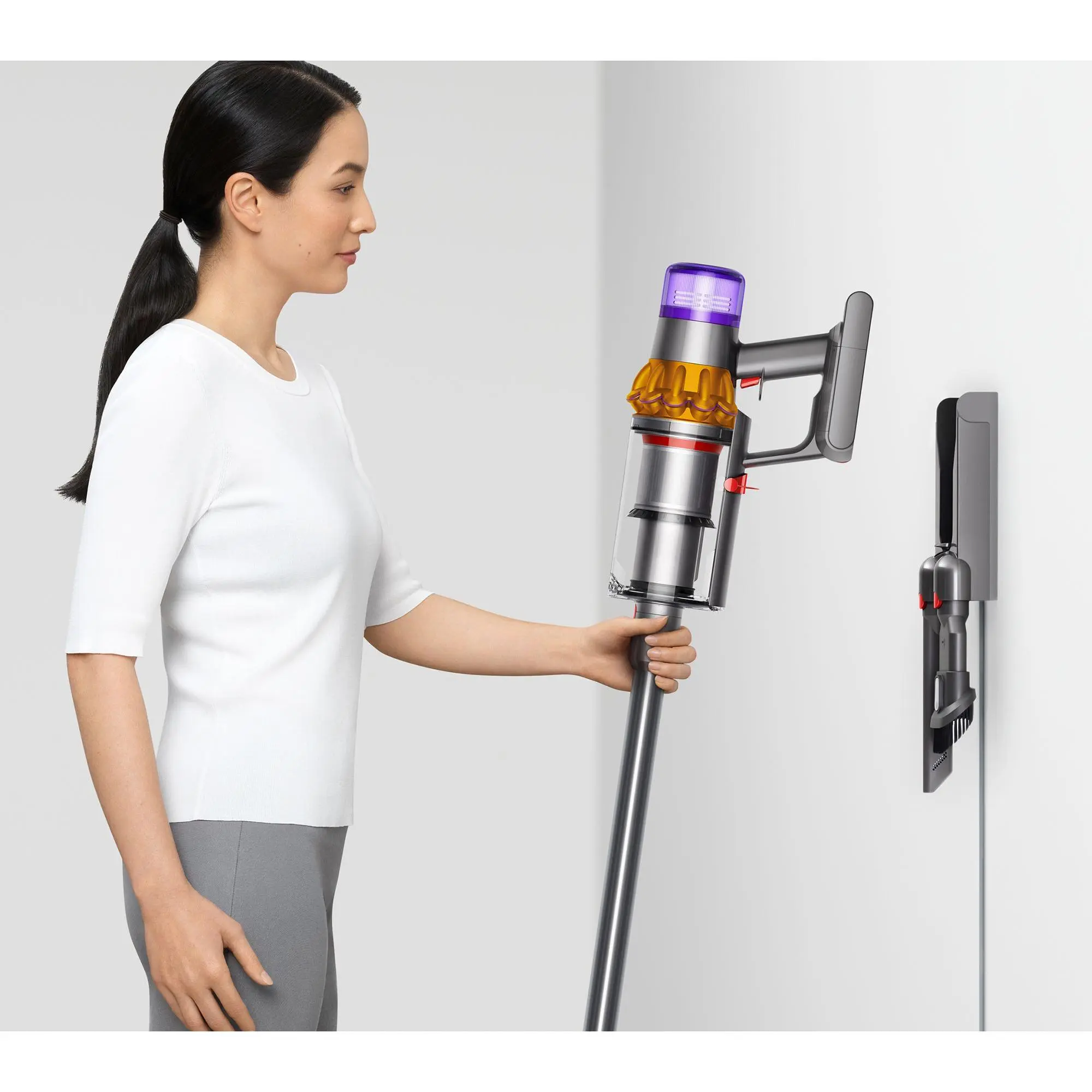 Untethered by a cord, this versatile vac tackles tough-to-reach areas and converts into a handheld unit for stairs, sofas, and car interiors. And you'll see what gets sucked up on the digital screen as you clean! There's also an included wall dock to store and charge your V15 Detect. Discover a deep clean with the Dyson V15 on duty. From Dyson.