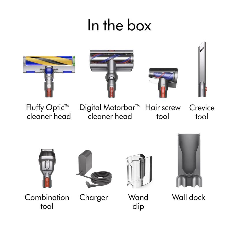 ·Includes Dyson V15 Detect cordless vacuum, Digital Motorbar cleaner head with anti-tangle comb, Fluffy Optic cleaner head with LED illumination, wall dock, charging adapter, combination tool, crevice tool, wand storage clip, and hair screw tool