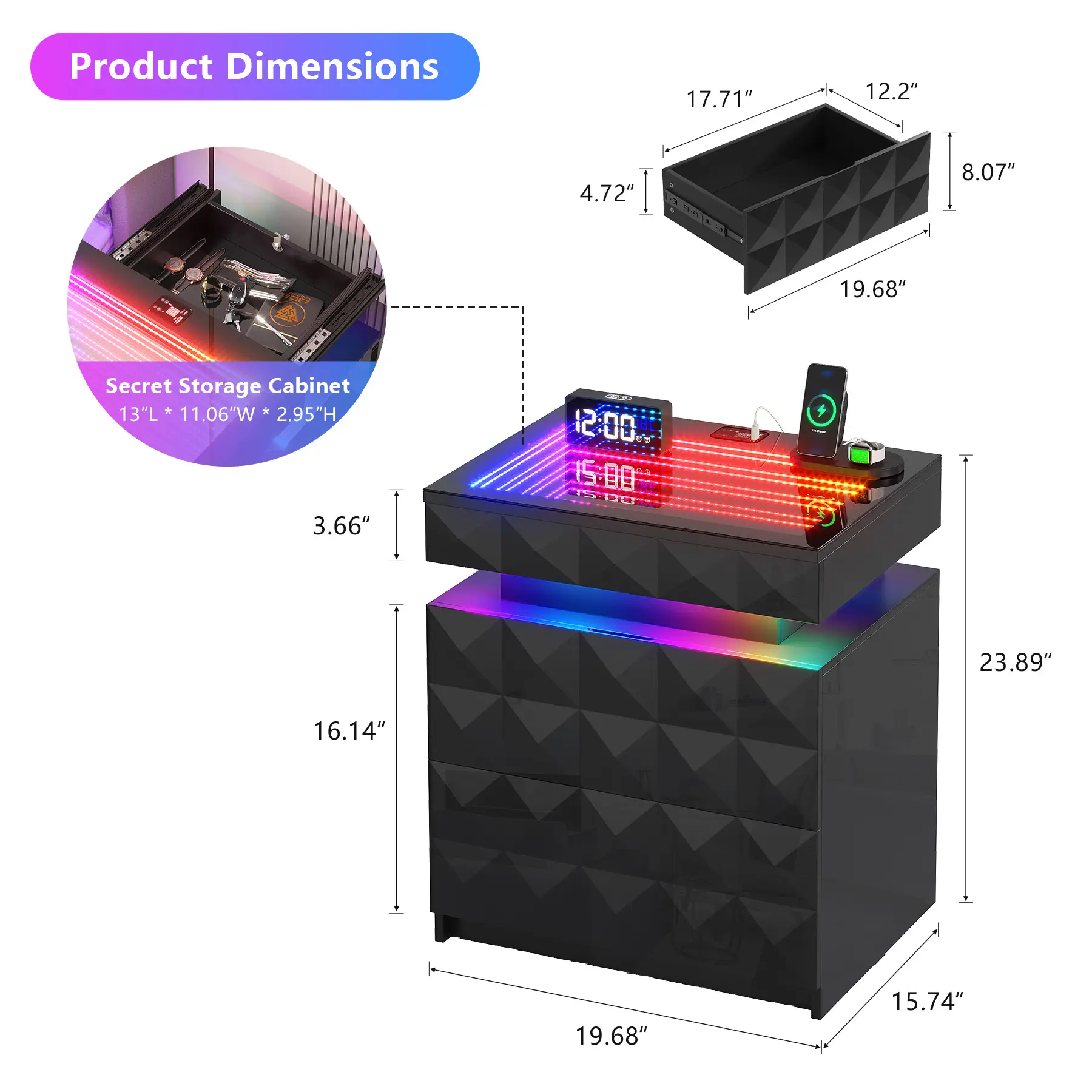 ·Tunnel Lighting Display Top: Unique glass tunnel-lighting surface that opens to reveal a personalized display area. Place small collectibles, jewelry, glasses, or watches inside for a stunning 3D tunnel-light effect. Adds a futuristic touch to your décor and makes the nightstand an eye-catching centerpiece.