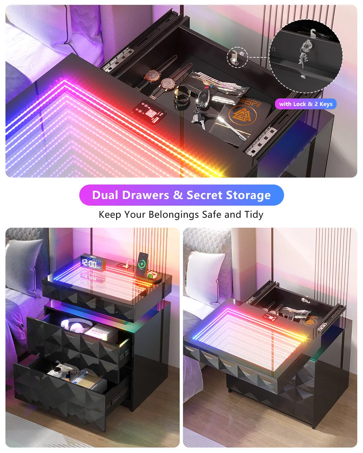 ·Large Storage Space: Built with two spacious drawers and a concealed, lockable compartment for private items. Holds books, chargers, skincare, and valuables while keeping sensitive belongings secure. Helps you stay organized and enjoy a clean, clutter-free bedroom with added privacy.