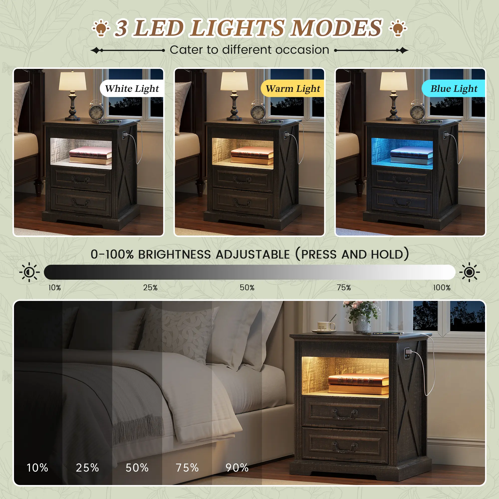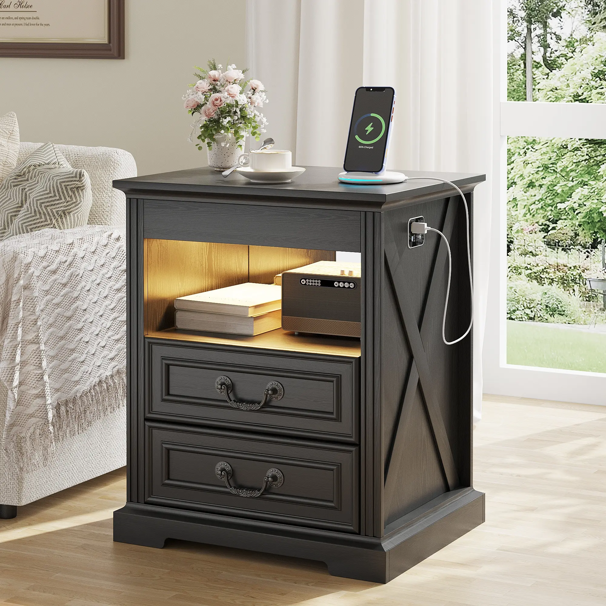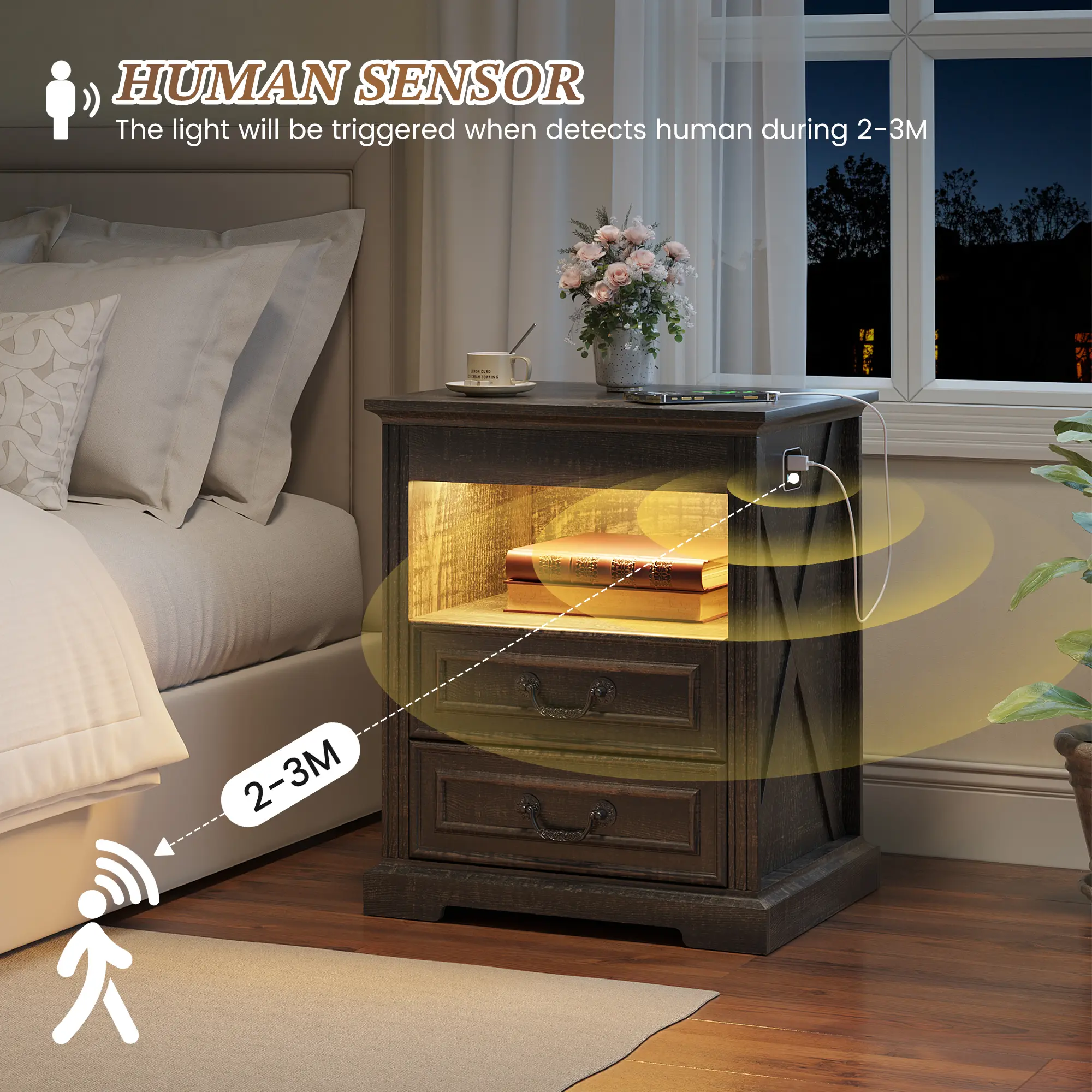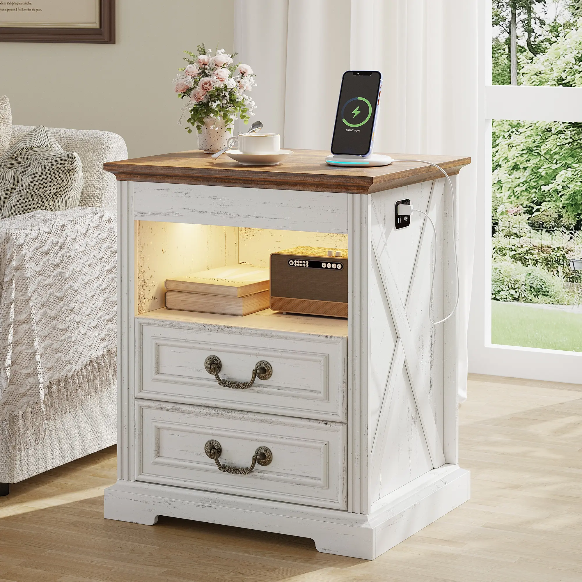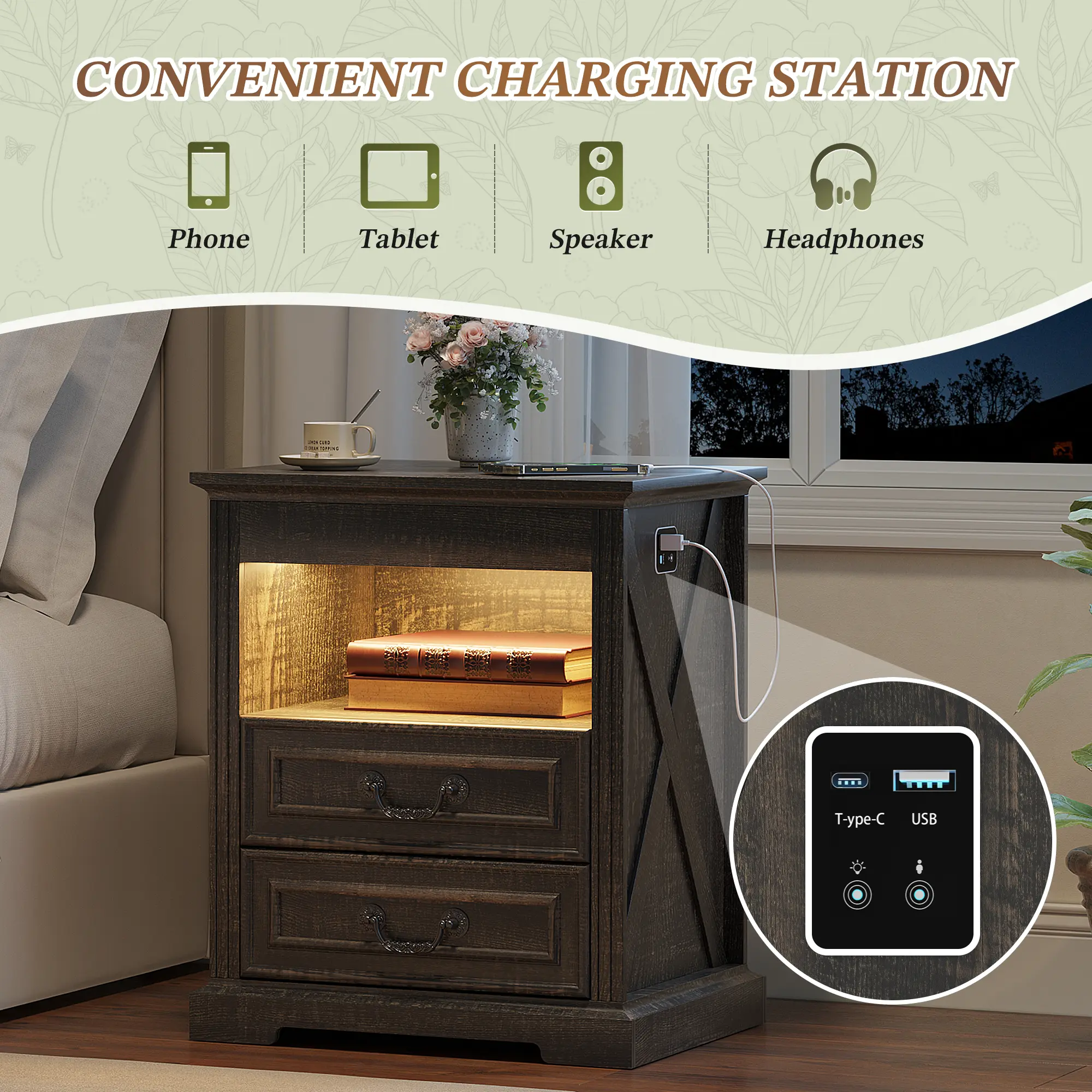 ·【Convenient Charger Station】With built-in USB and Type-C charging ports, this bedside table takes the hassle out of finding wall outlets and cable clutter. The charging experience at your fingertips makes your bedroom or living room more convenient and comfortable to use