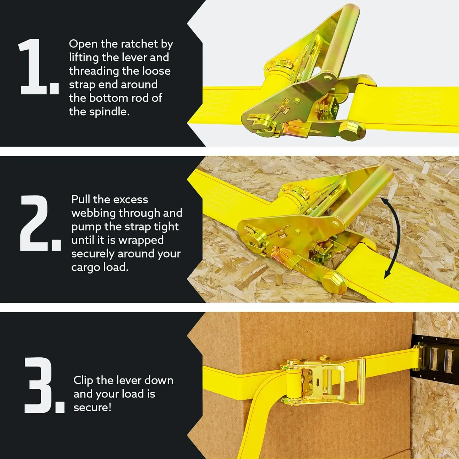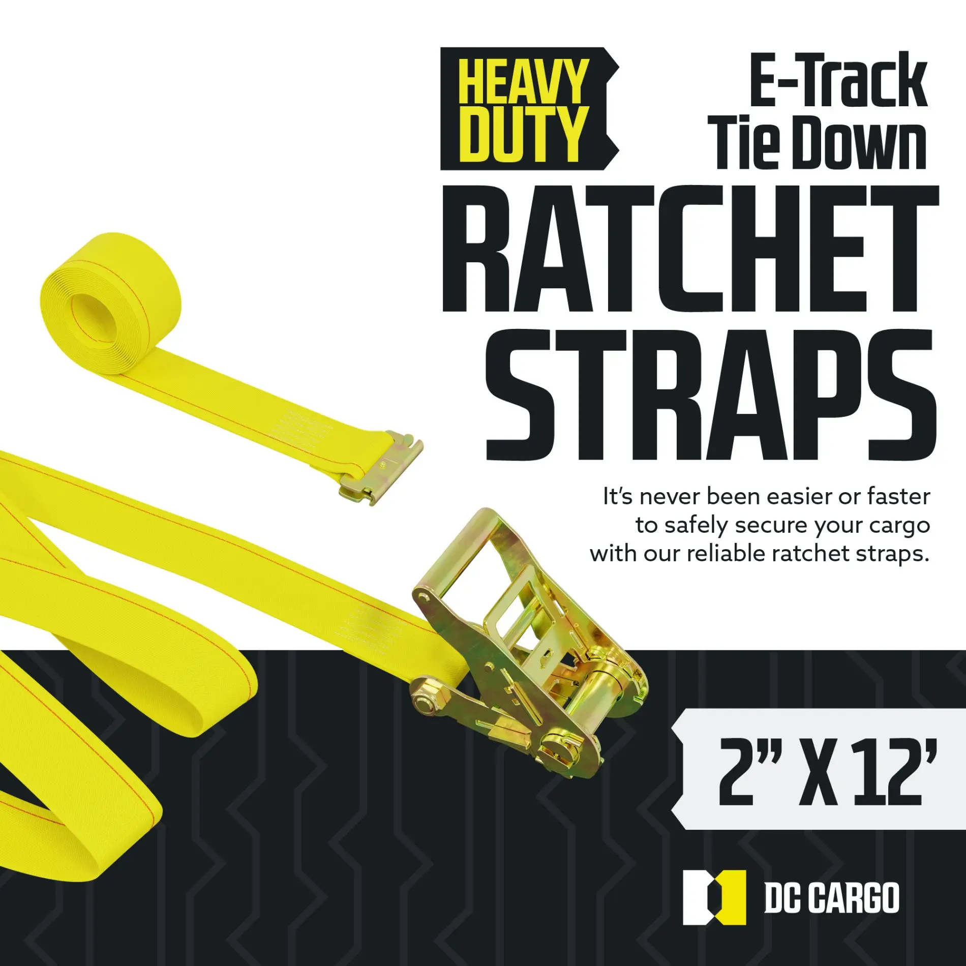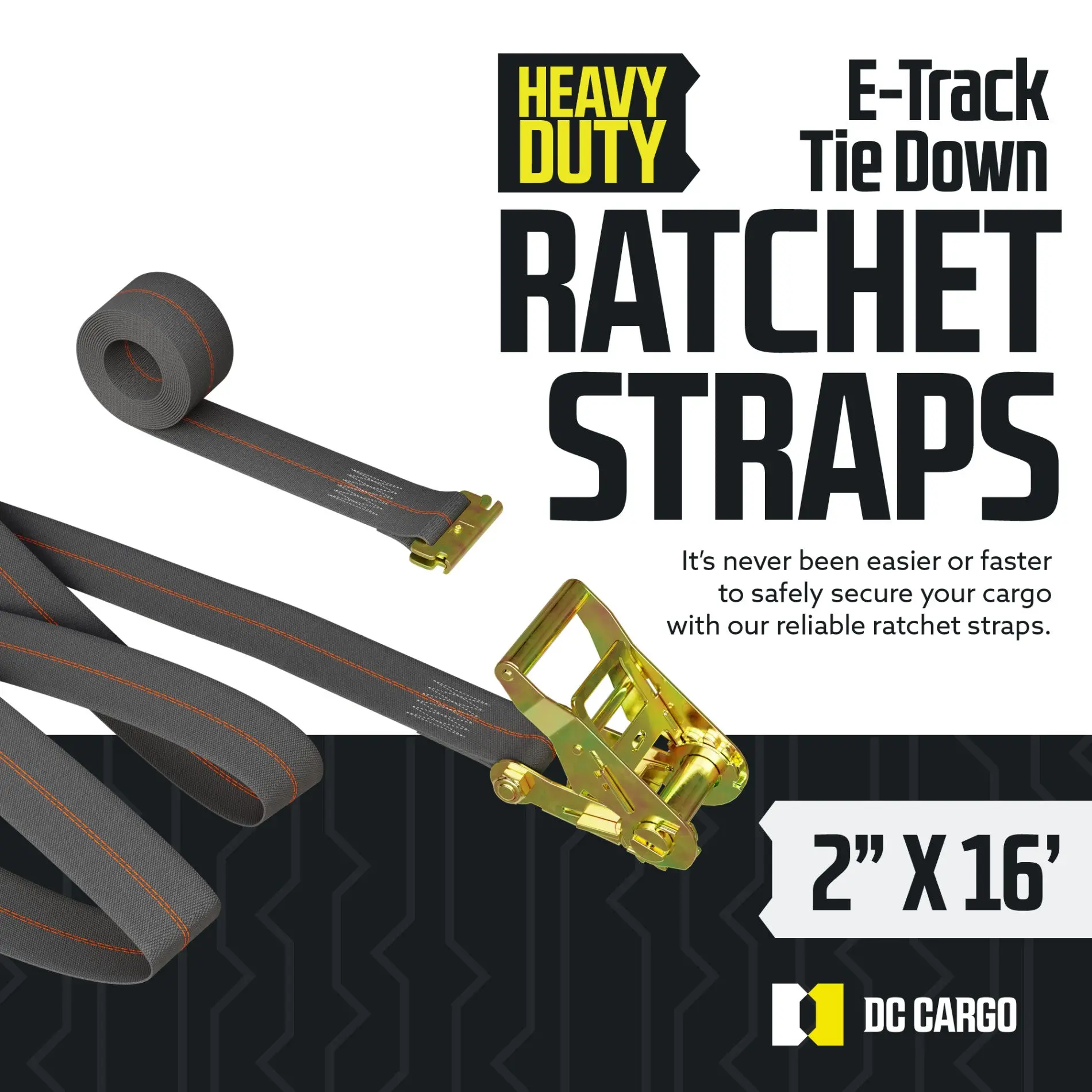DURABLE - Never replace your straps again! These Ratchet Tie-Down Cargo Straps are made out of durable yellow polyester webbing (strap material) that is water- and UV ray- resistant. They won't shrink or stretch even when wet. The steel ratchet is made to ensure the most reliable trailer and truck cargo securement throughout the bumpiest rides.
