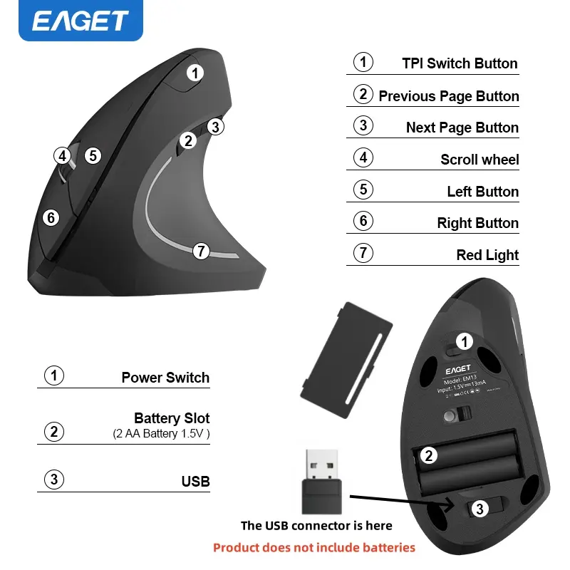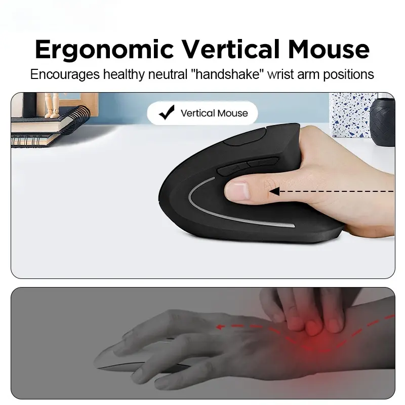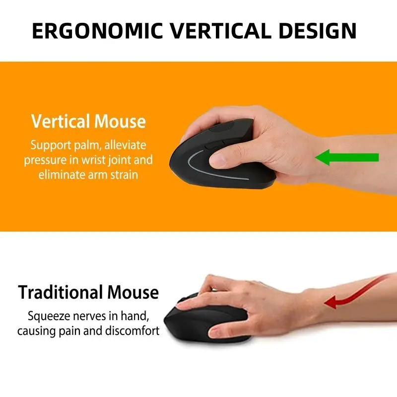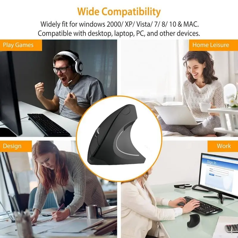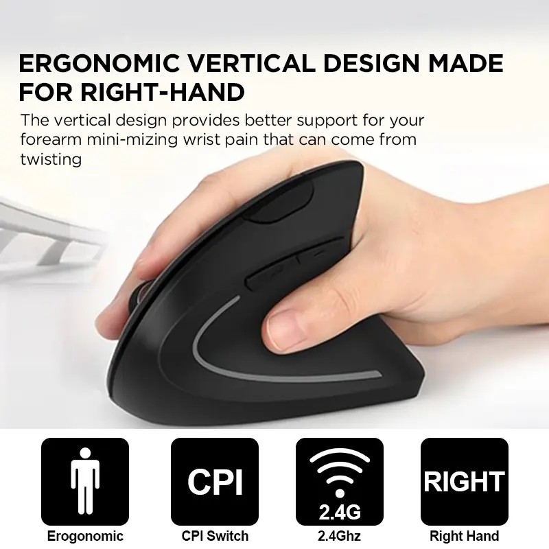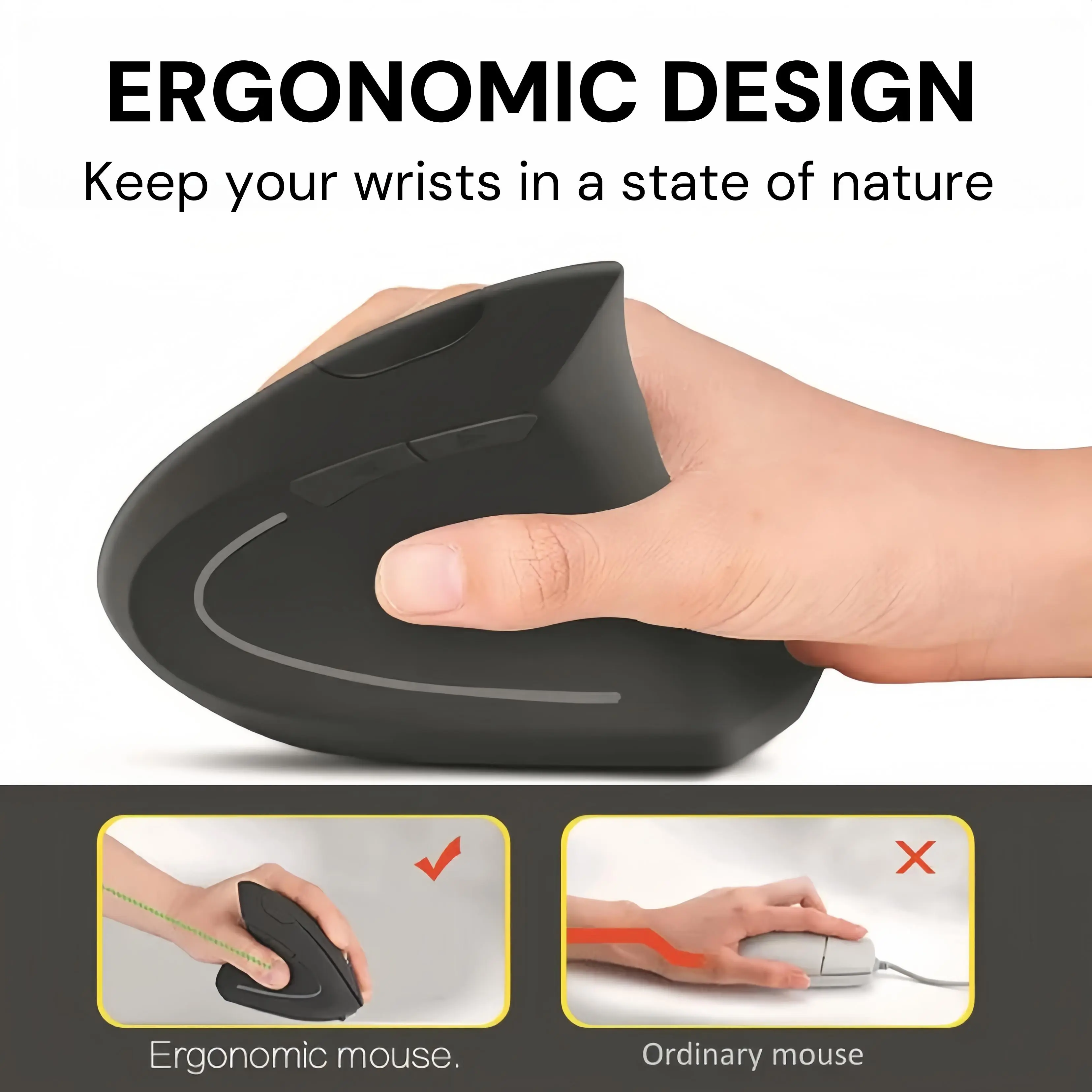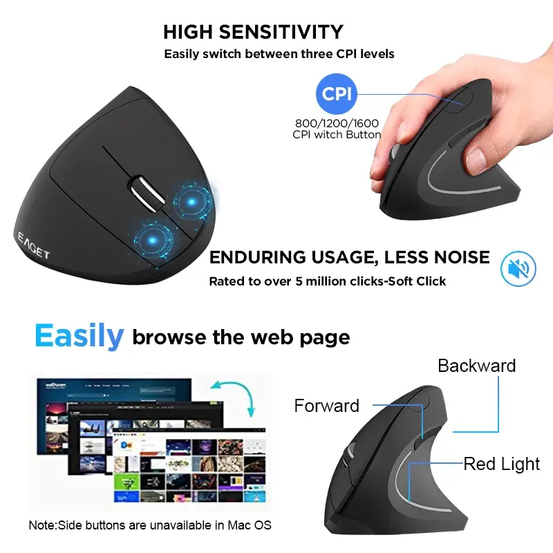 Tired of wrist pain after hours at your desk? Meet the EAGET Wireless Ergonomic Performance Mouse, designed to keep your hand comfy with its vertical grip that promotes a natural handshake position. Say goodbye to cords with a reliable 2.4GHz wireless connection that keeps your workspace clutter-free. Whether you're gaming or working, customize your precision with three DPI settings (800/1200/1600) for smooth, accurate control. Enjoy quiet clicks that won't disturb your focus or coworkers, plus a soft rubber grip that feels great even after long use. The mouse comes with a USB receiver that stores neatly at the bottom, so you won’t lose it. Compatible with most desktop PCs (note: side buttons are disabled on Mac OS), it’s compact yet built to last over 5 million clicks. Upgrade your setup with this sleek black ergonomic mouse and experience comfort and performance in one stylish package. Ready to reduce wrist strain and boost productivity? Grab yours today and feel the difference!