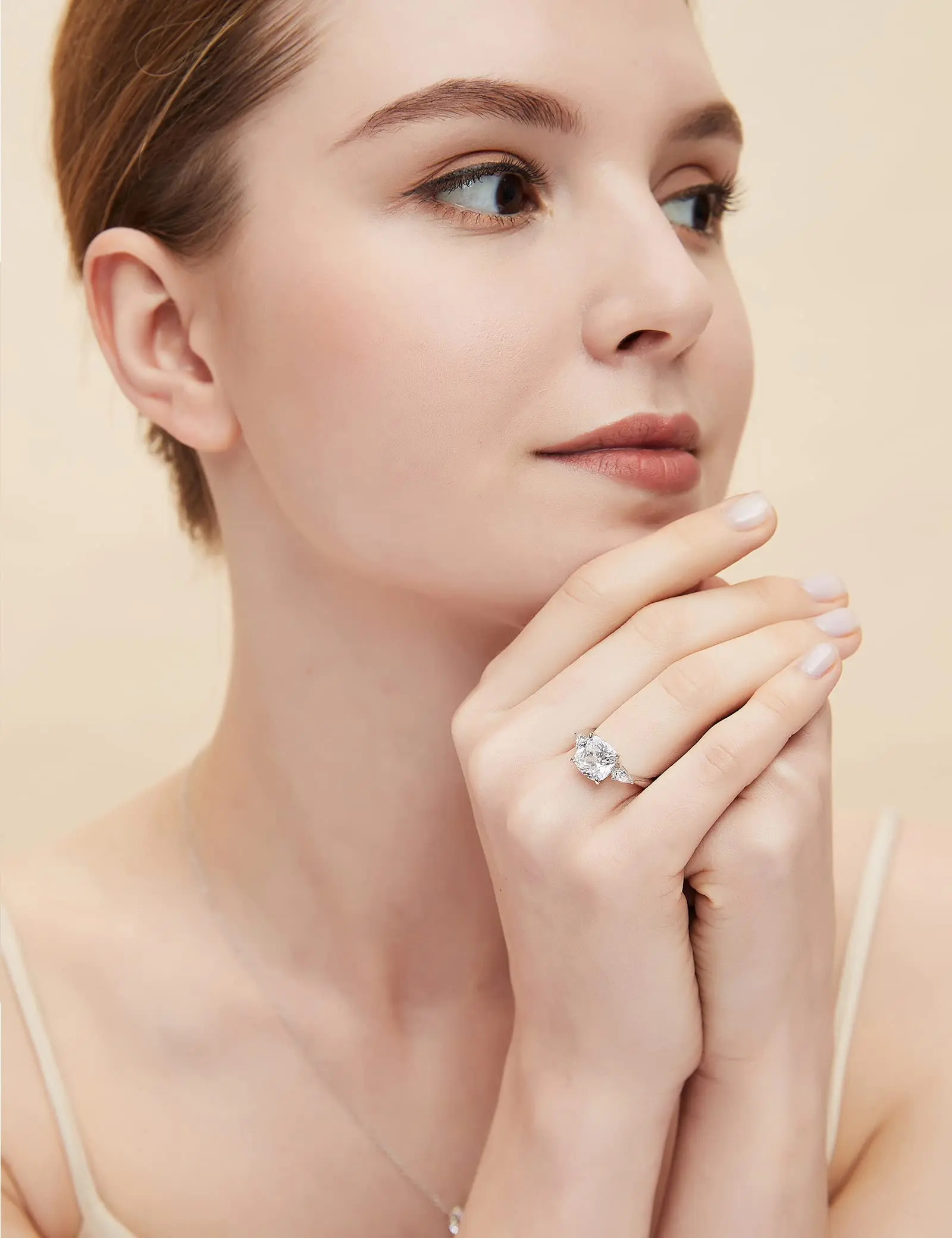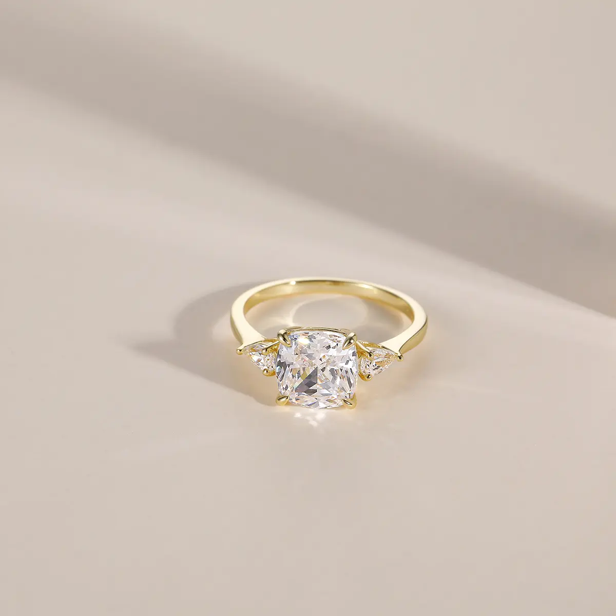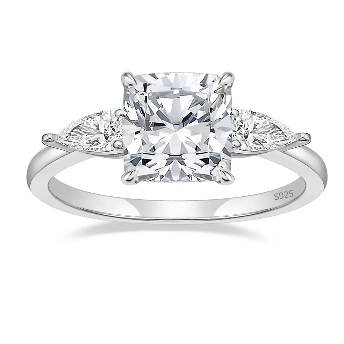 ·♥ Stylish ♥ Captivating two pear-shaped stones brilliantly frame the center stone in this classic three stone ring. The petite band gently tapers and secures the gems in a basket setting